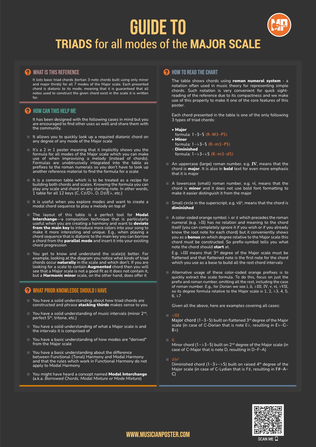 - It's a 2 in 1 poster meaning that it implicitly shows you the formula for all modes of the Major scale which you can make use of when improvising a melody (instead of chords). Formulas are unobtrusively integrated into the table as prefixes to the roman numerals so you don't have to look up another reference material to find the formula for a scale.