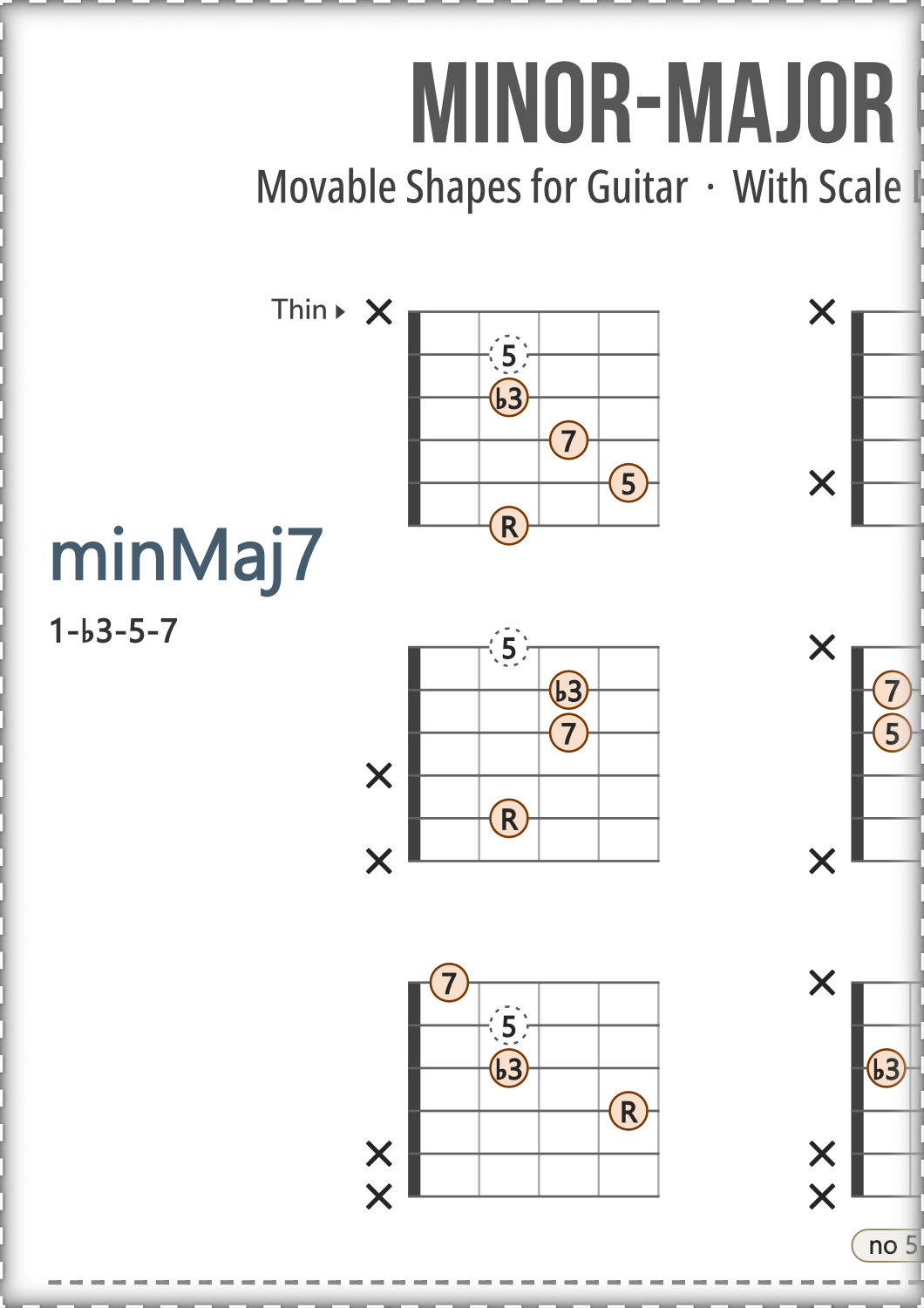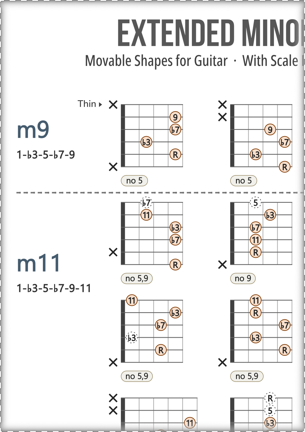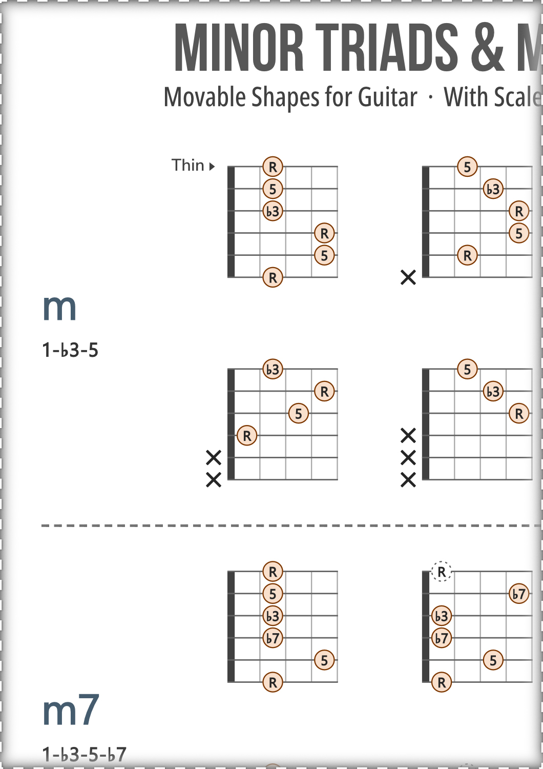 Guitar chord charts covering chord types from the Minor family, featuring movable shapes in root position with multiple voicings for each type, shown with scale degrees.