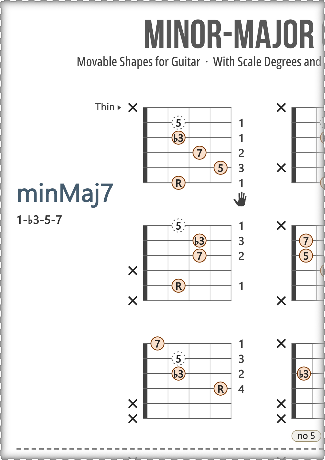 Guitar chord charts covering chord types from the Minor family, featuring movable shapes in root position with multiple voicings for each type, shown with scale degrees and finger numbers.