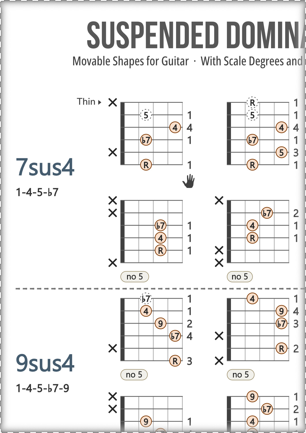 | 9sus4 | Dominant 9th Sus4 | 1-4-5-b7-9 | 9sus, 7sus4(9), 7sus(9) |