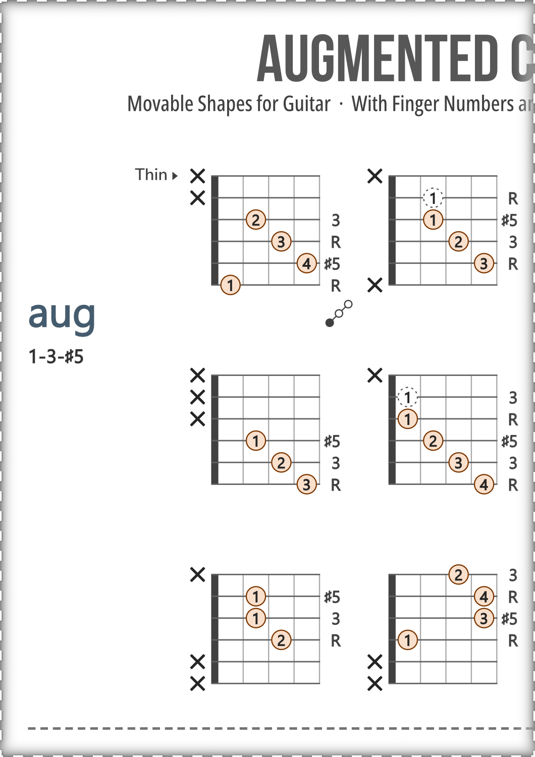 Guitar chord chart covering chord types from the Augmented family, featuring movable shapes in root position with multiple voicings for each type, shown with finger numbers and scale degrees.