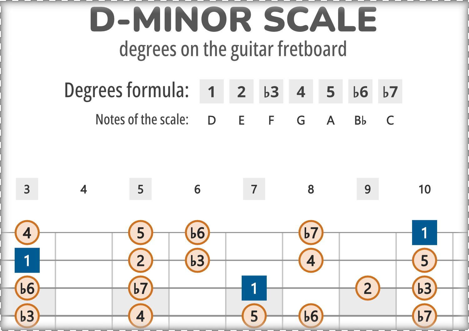Map showing all intervals of the D-Minor scale across the entire fretboard.