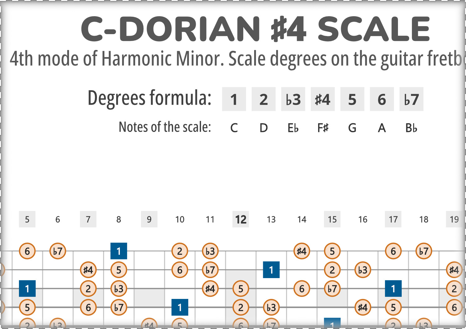 Map showing all intervals of the C-Dorian #4 scale across the entire guitar fretboard.