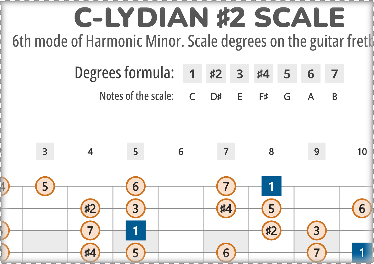 C-Lydian #2 is the 6th relative mode of the E-Harmonic Minor scale and consists of the following notes: C, D#, E, F#, G, A, B. In other words, it shares the same notes as the E-Harmonic Minor scale but is centered around C as the root note, giving it a unique modal character.