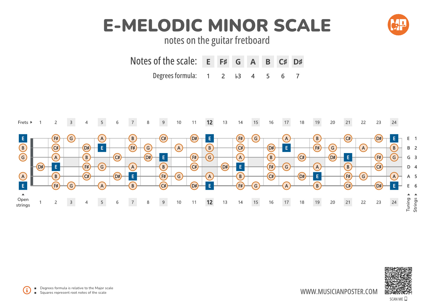 - Scale Formula: Notes that make up the E-Melodic Minor scale and its degrees formula are conveniently placed right above the diagram so that you don't need to look up another reference.