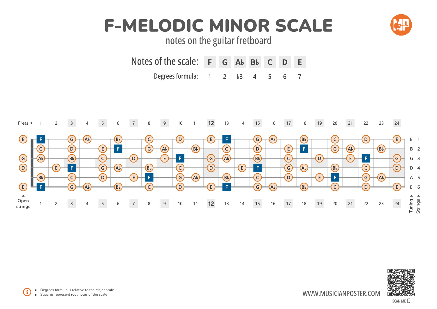 - Scale Formula: Notes that make up the F-Melodic Minor scale and its degrees formula are conveniently placed right above the diagram so that you don't need to look up another reference.