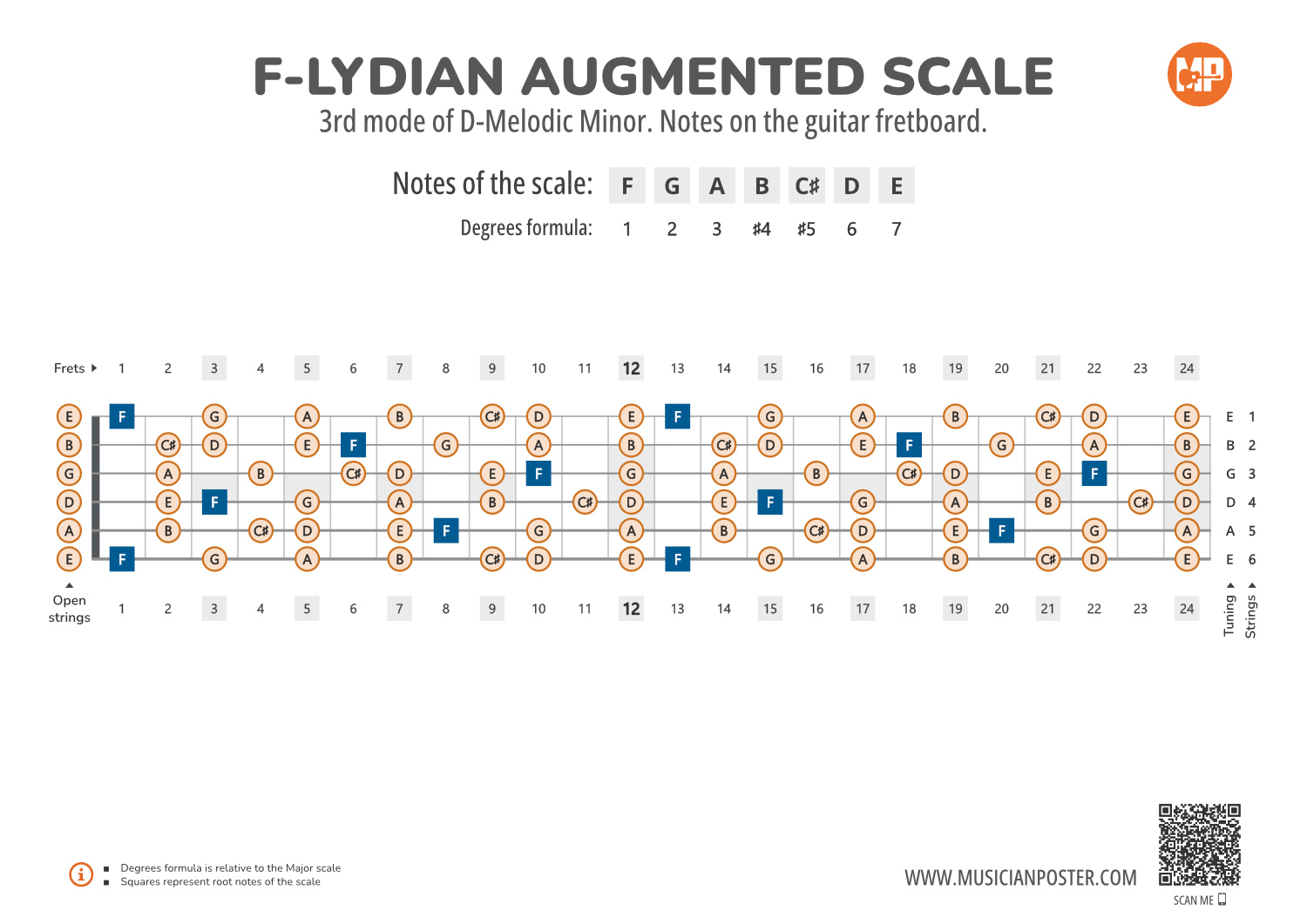 - Scale Formula: Notes that make up the F-Lydian Augmented scale and its degrees formula are conveniently placed right above the diagram so that you don't need to look up another reference.