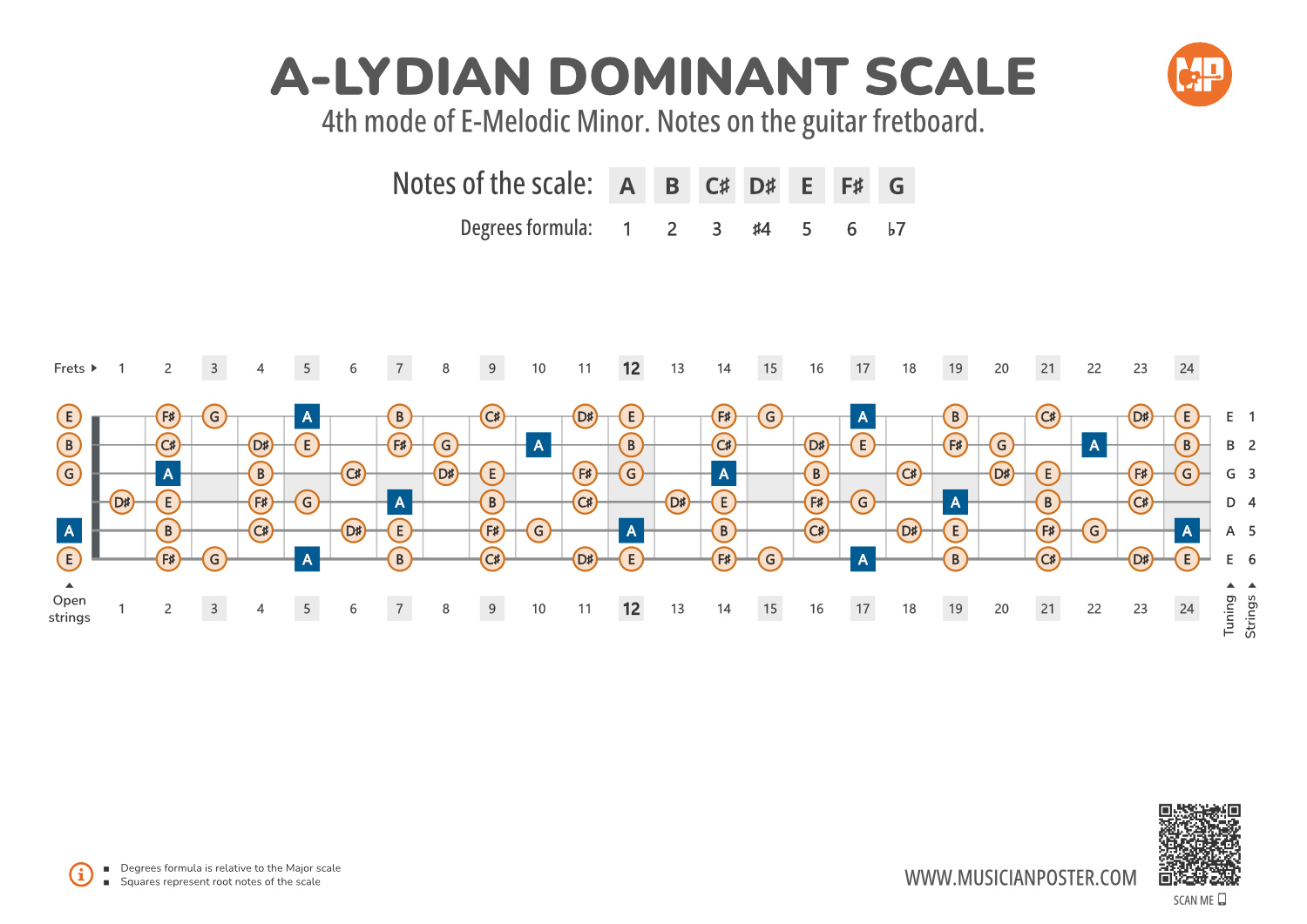 - Scale Formula: Notes that make up the A-Lydian Dominant scale and its degrees formula are conveniently placed right above the diagram so that you don't need to look up another reference.