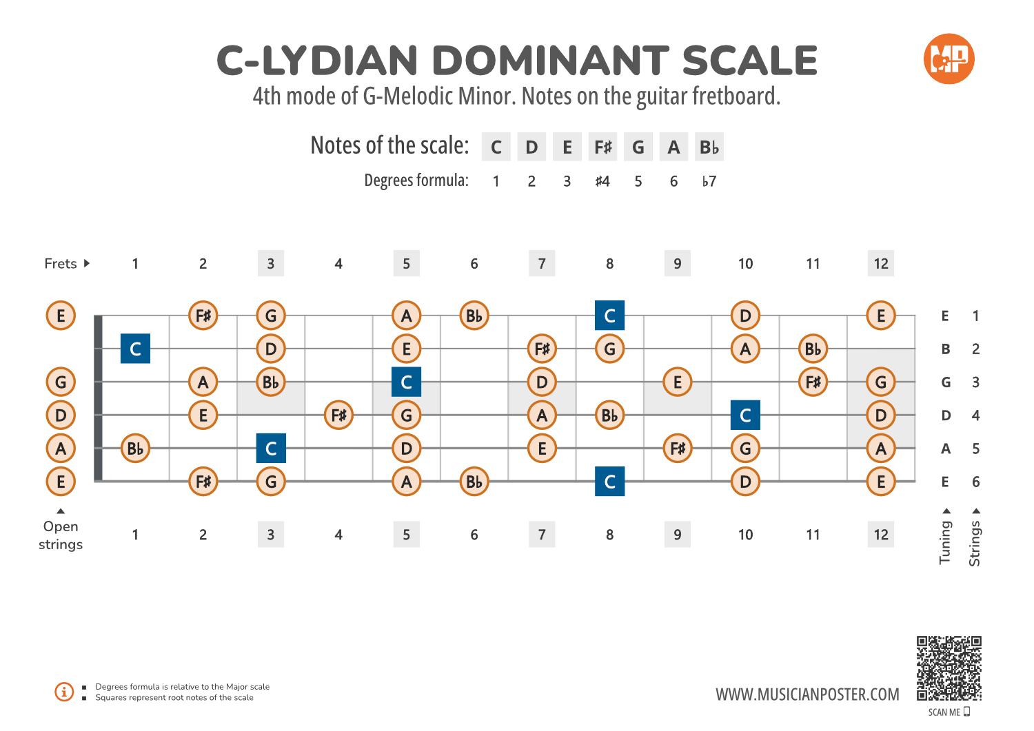 - Scale Formula: Notes that make up the C-Lydian Dominant scale and its degrees formula are conveniently placed right above the diagram so that you don't need to look up another reference.