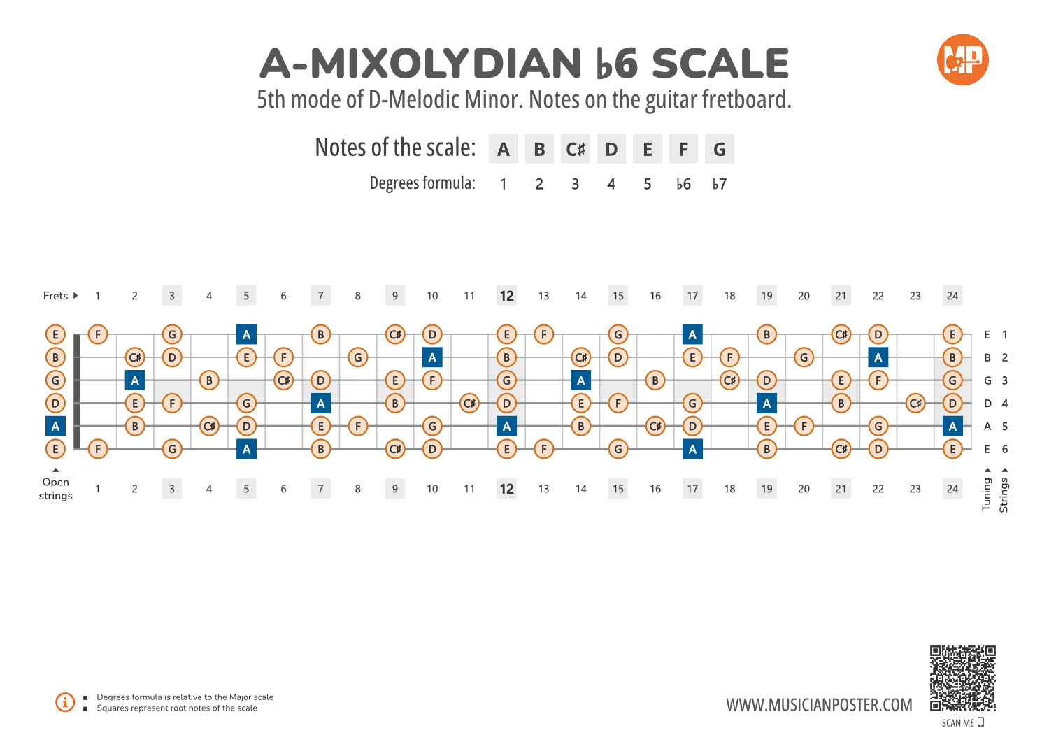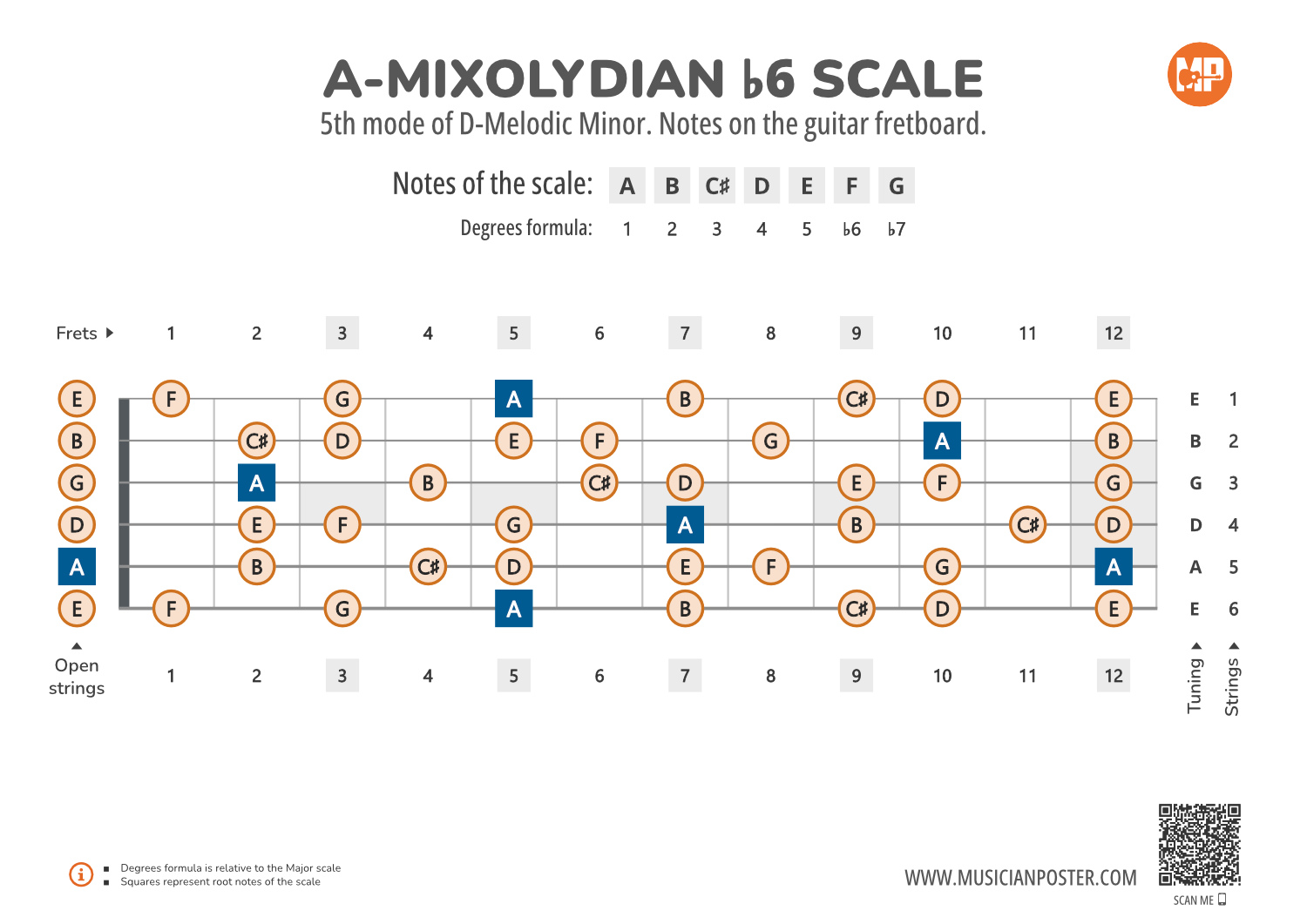 - Scale Formula: Notes that make up the A-Mixolydian b6 scale and its degrees formula are conveniently placed right above the diagram so that you don't need to look up another reference.