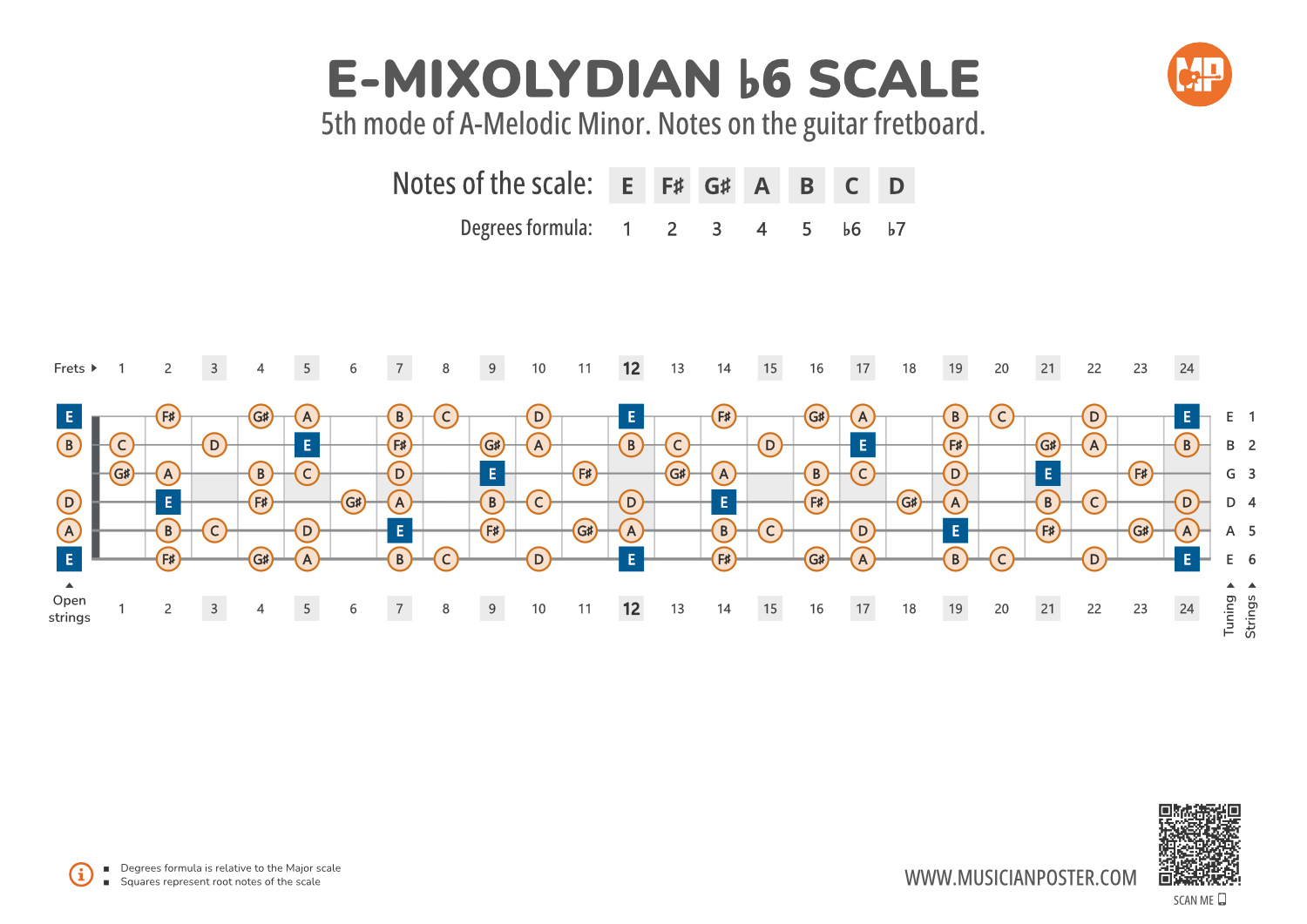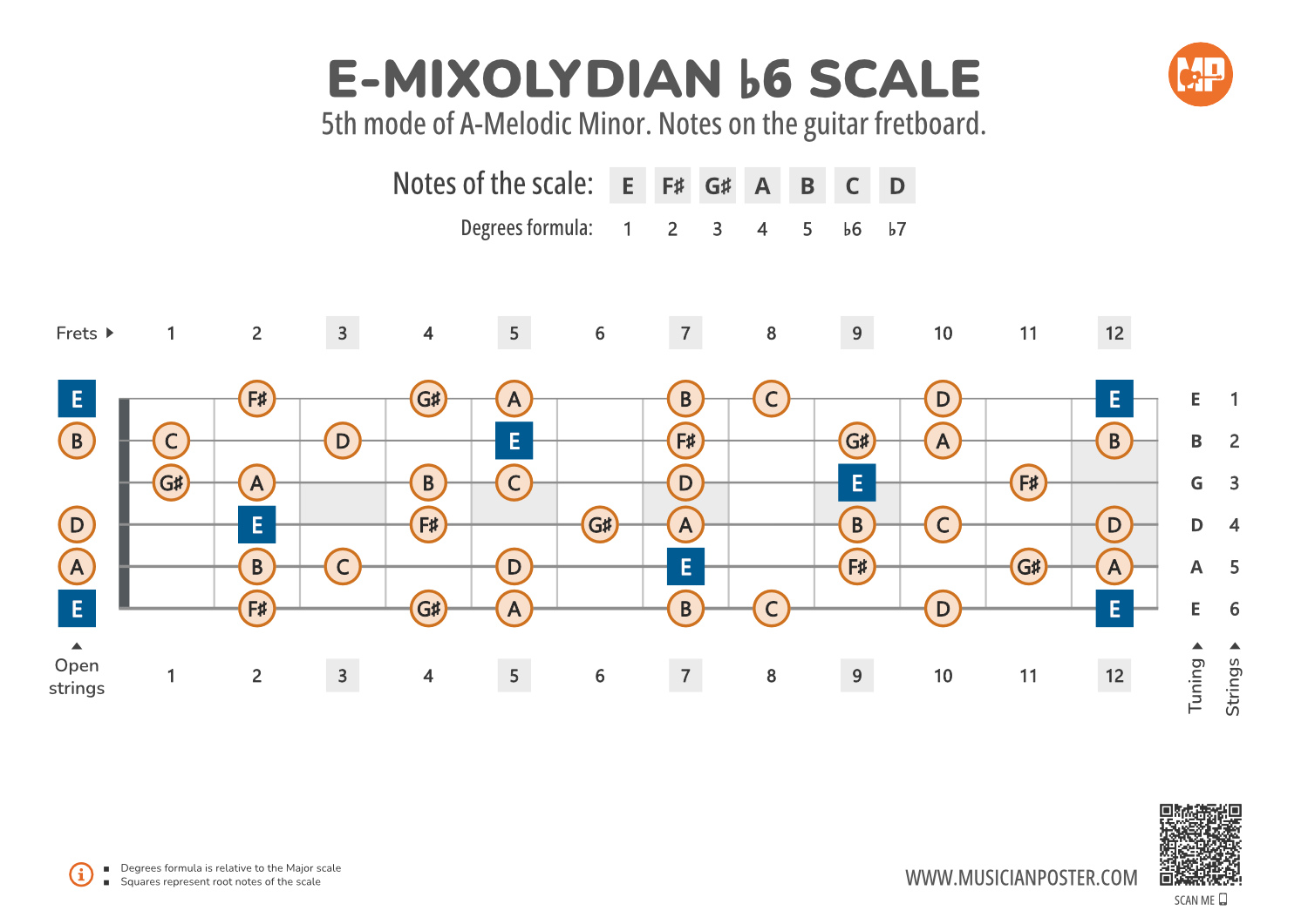 - Scale Formula: Notes that make up the E-Mixolydian b6 scale and its degrees formula are conveniently placed right above the diagram so that you don't need to look up another reference.