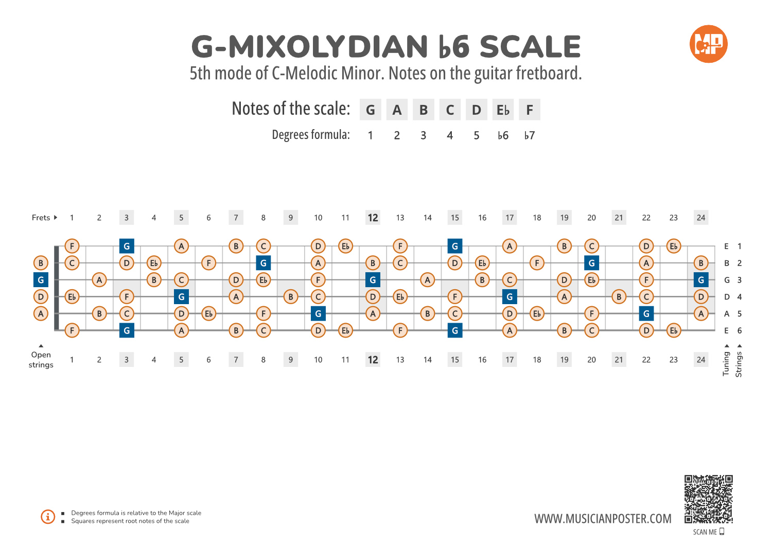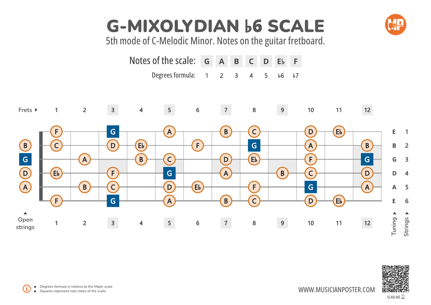 - Scale Formula: Notes that make up the G-Mixolydian b6 scale and its degrees formula are conveniently placed right above the diagram so that you don't need to look up another reference.