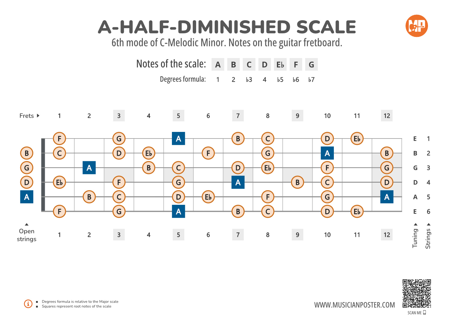 - Scale Formula: Notes that make up the A-Half-Diminished scale and its degrees formula are conveniently placed right above the diagram so that you don't need to look up another reference.