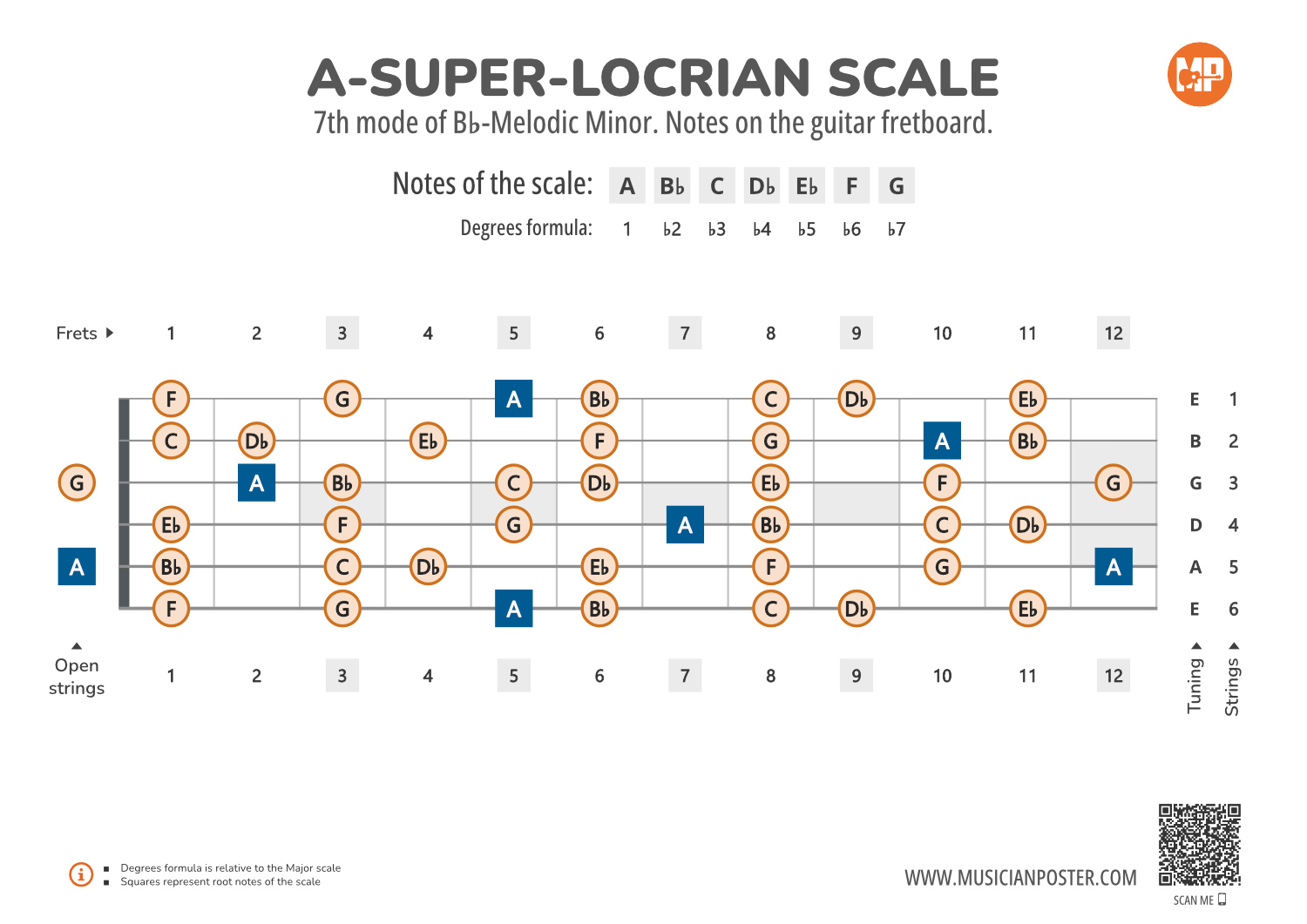 - Scale Formula: Notes that make up the A-Super-Locrian scale and its degrees formula are conveniently placed right above the diagram so that you don't need to look up another reference.