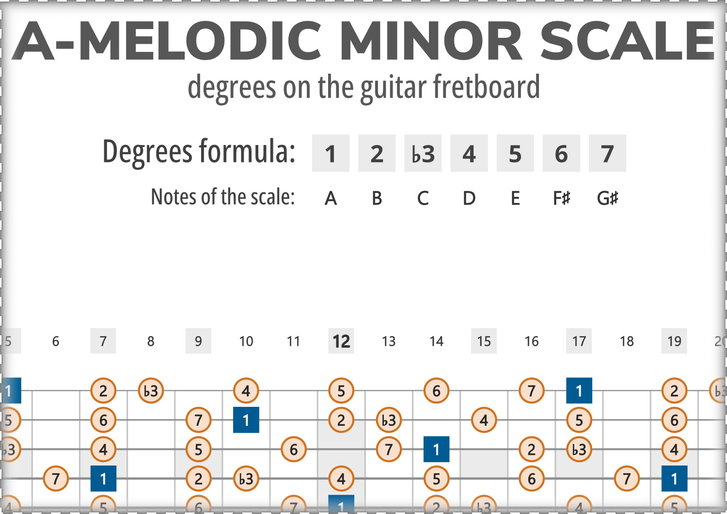 Map showing all intervals of the A-Melodic Minor scale across the entire guitar fretboard.