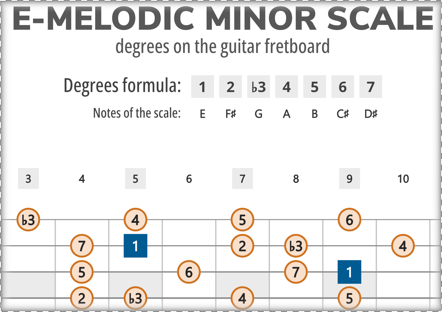 Map showing all intervals of the E-Melodic Minor scale across the entire guitar fretboard.