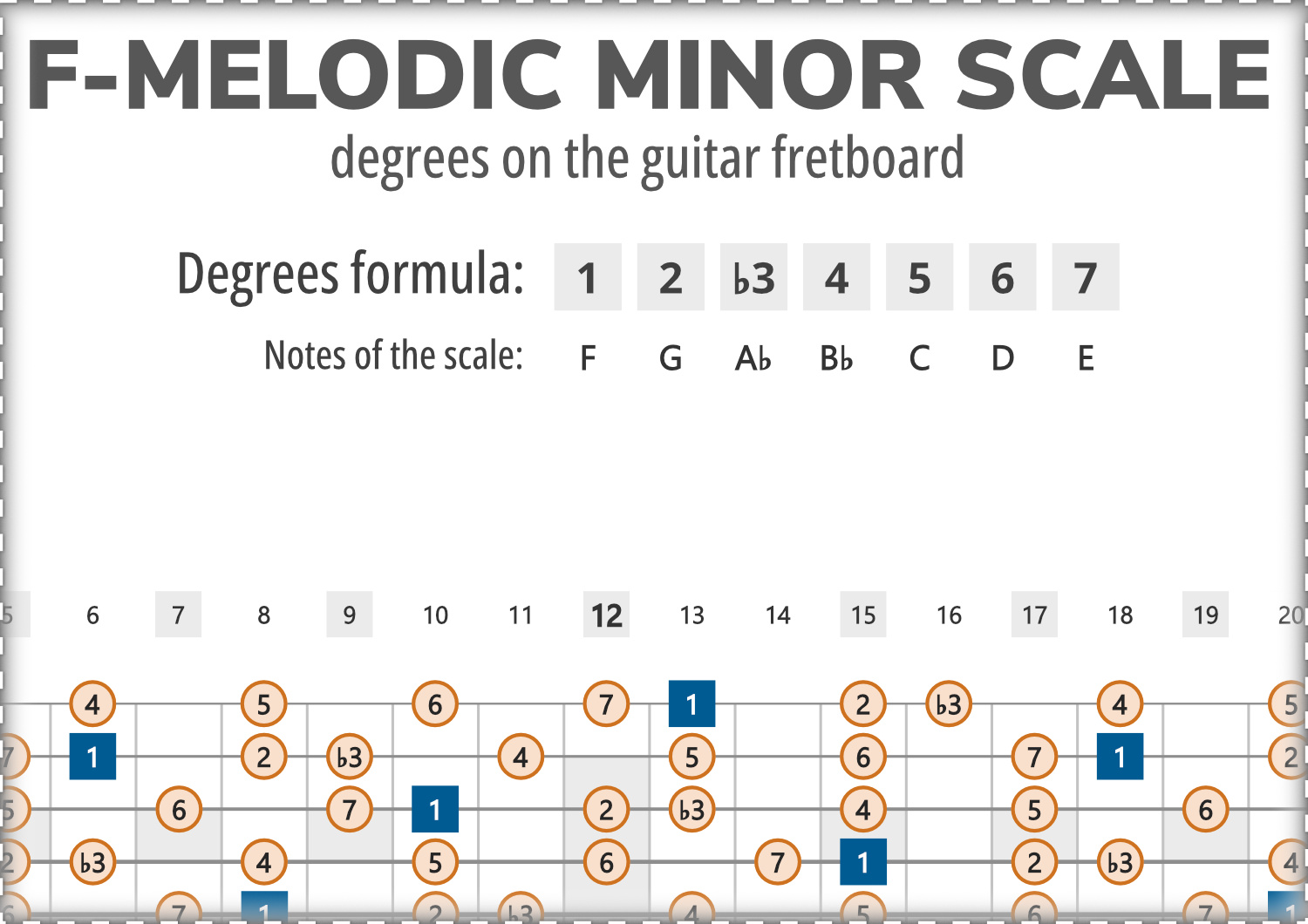 Map showing all intervals of the F-Melodic Minor scale across the entire guitar fretboard.