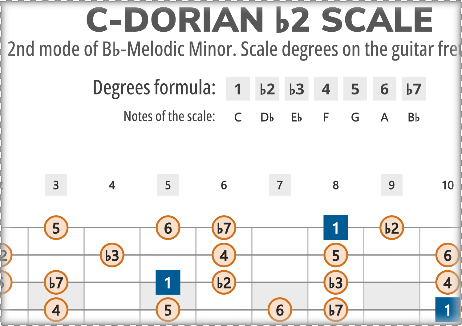 C-Dorian b2 is the 2nd relative mode of the Bb-Melodic Minor scale and consists of the following notes: C, Db, Eb, F, G, A, Bb. In other words, it shares the same notes as the Bb-Melodic Minor scale but is centered around C as the root note, giving it a unique modal character.