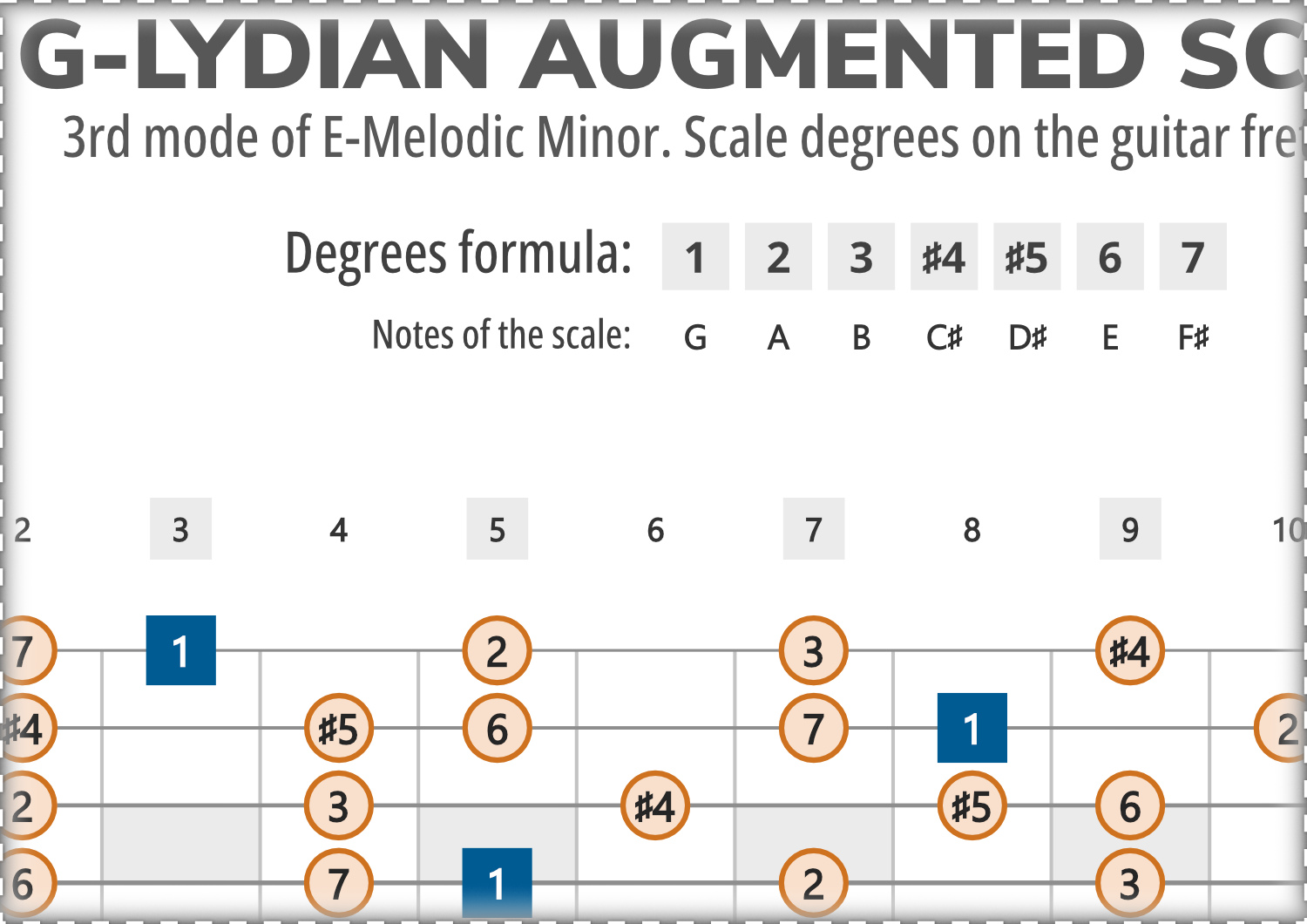 G-Lydian Augmented is the 3rd relative mode of the E-Melodic Minor scale and consists of the following notes: G, A, B, C#, D#, E, F#. In other words, it shares the same notes as the E-Melodic Minor scale but is centered around G as the root note, giving it a unique modal character.