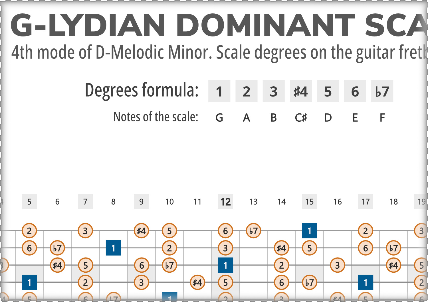 G-Lydian Dominant consists of the notes G, A, B, C#, D, E, F, and its scale-degree formula is 1-2-3-#4-5-6-b7.