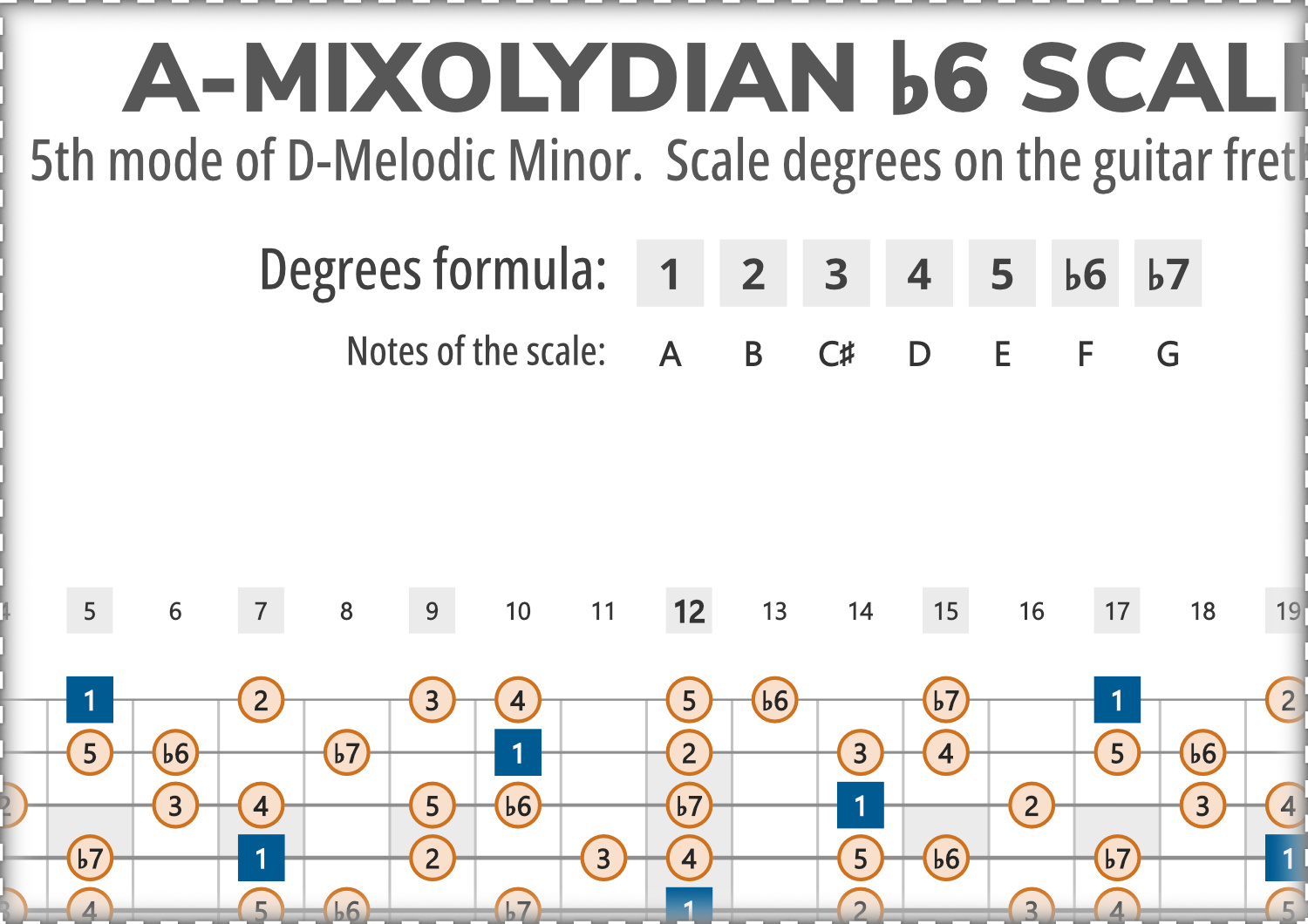 A-Mixolydian b6 consists of the notes A, B, C#, D, E, F, G, and its scale-degree formula is 1-2-3-4-5-b6-b7.