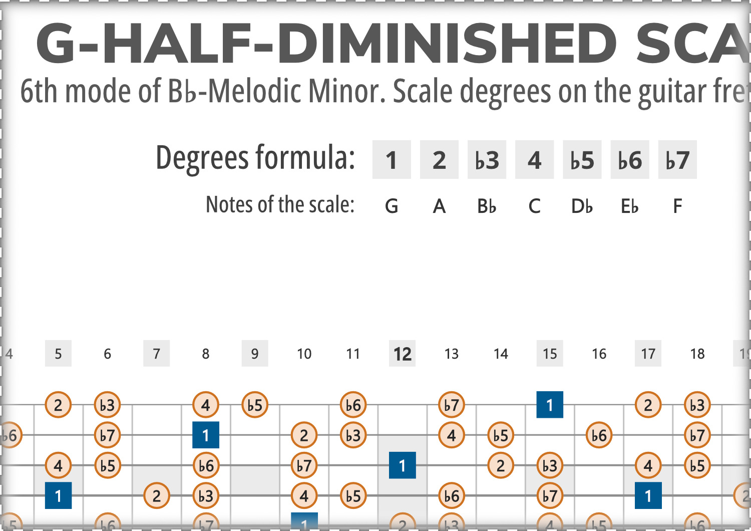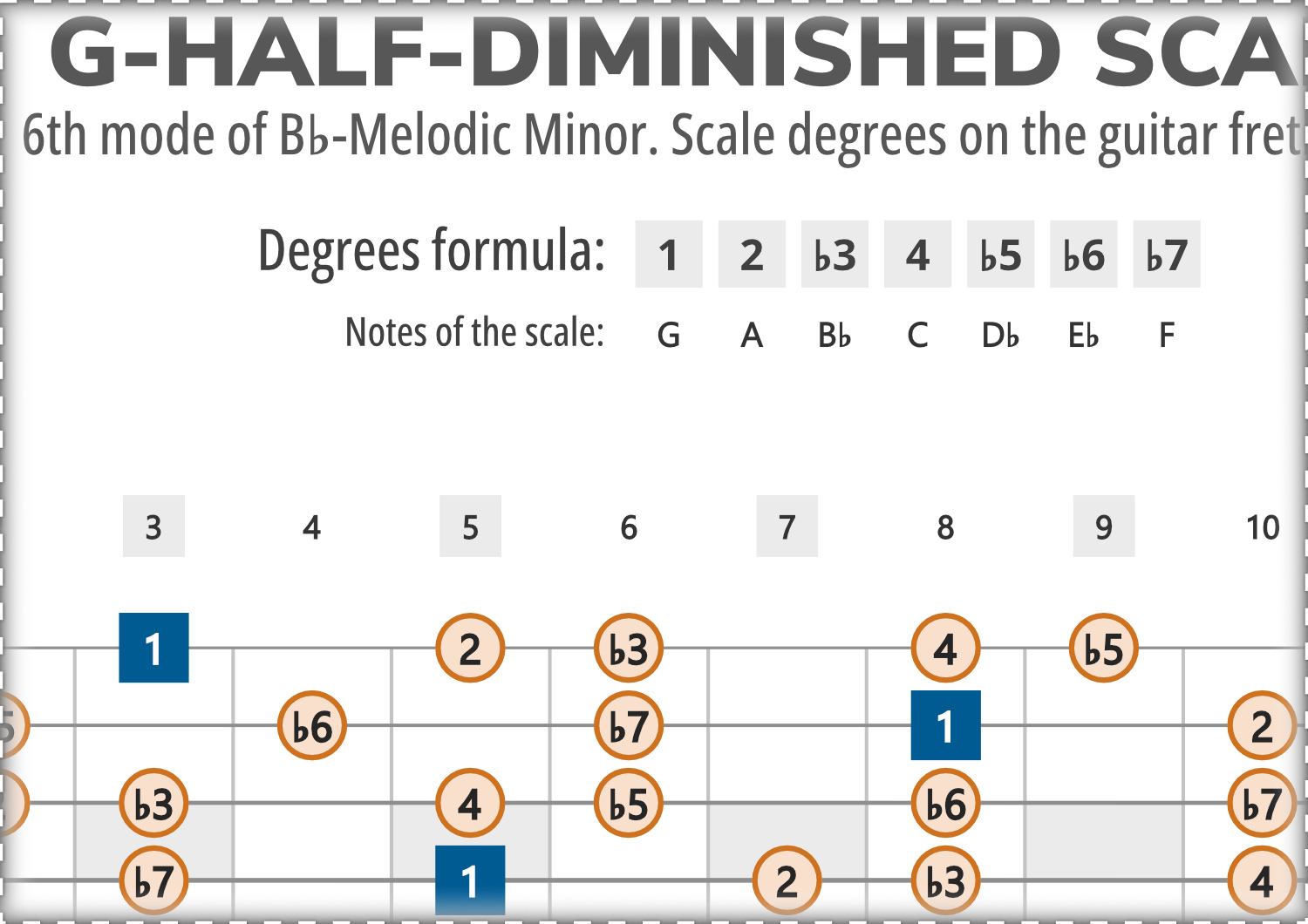 G-Half-Diminished consists of the notes G, A, Bb, C, Db, Eb, F, and its scale-degree formula is 1-2-b3-4-b5-b6-b7.