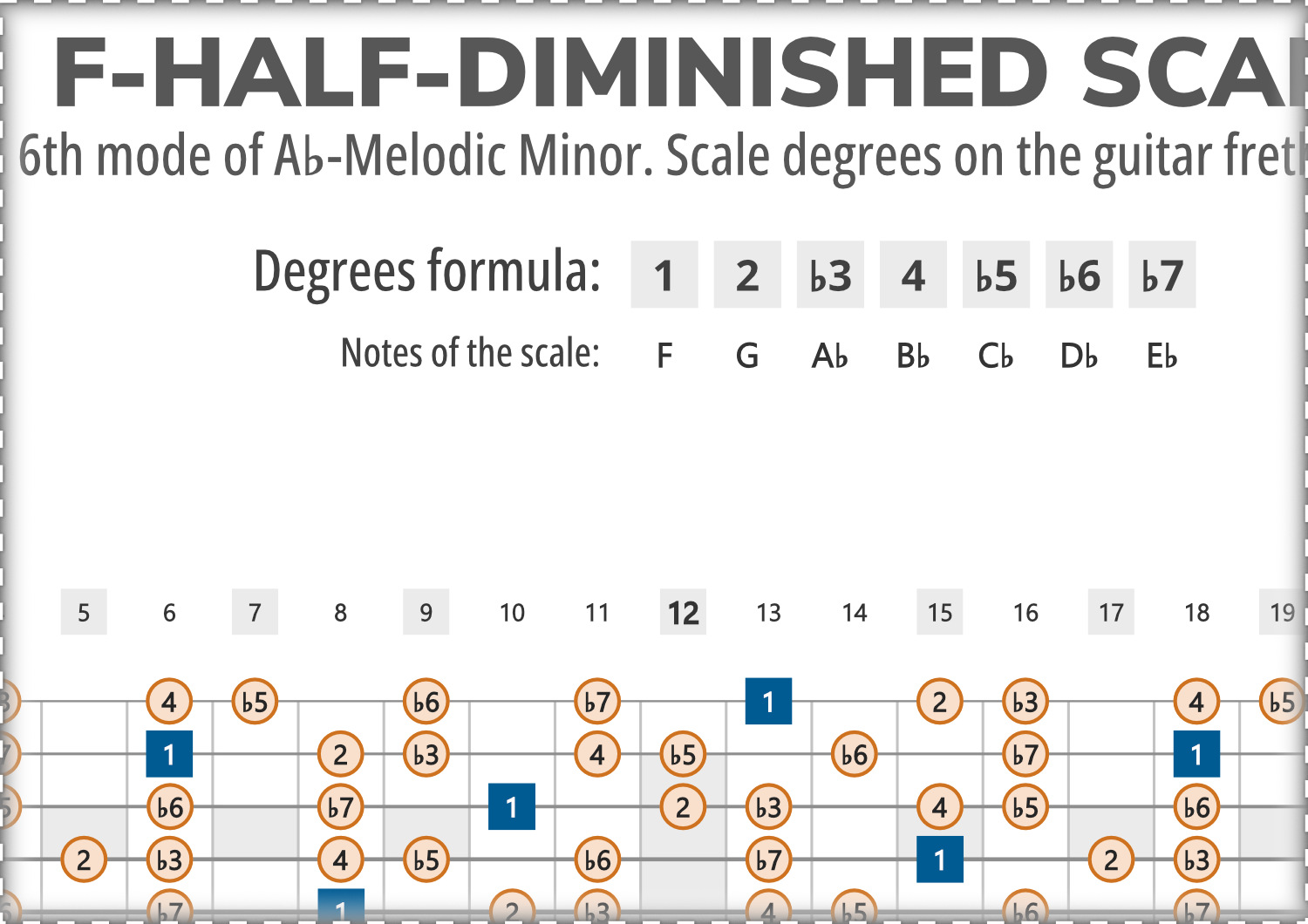 F-Half-Diminished consists of the notes F, G, Ab, Bb, Cb, Db, Eb, and its scale-degree formula is 1-2-b3-4-b5-b6-b7.