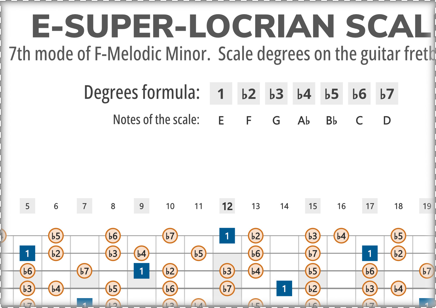 E-Super Locrian is the 7th relative mode of the F-Melodic Minor scale. In other words, it shares the same notes as the F-Melodic Minor scale but is centered around E as the root note, giving it a unique modal character.