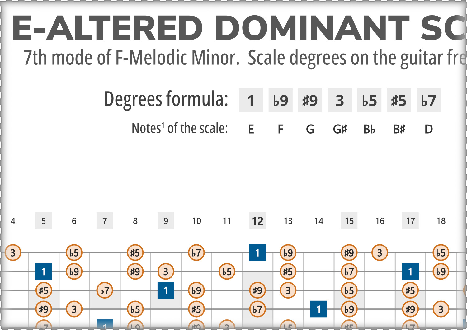 Note: This scale is also known by another common name: the Altered Dominant scale. When we use that particular name we usually think of it in terms of altered-chord tensions, expressed as 1-b9-#9-3-b5-#5-b7 (or 1-b9-#9-3-#11-b13-b7). It's exactly the same scale—just spelled differently. But describing the scale this way highlights its direct relationship to the altered dominant chord which is really convenient. That's why I've also created a variation of the chart that focuses on altered tensions. Lastly, with that interpretation, the note spelling shifts accordingly: E, F, F##, G#, Bb, B#, D (or E, F, F##, G#, A#, C, D).