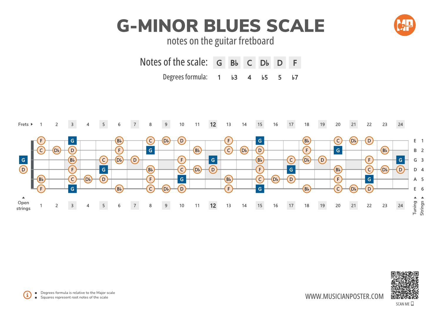 - Scale Formula: Notes that make up the G-Minor Blues scale and its degrees formula are conveniently placed right above the diagram so that you don't need to look up another reference.