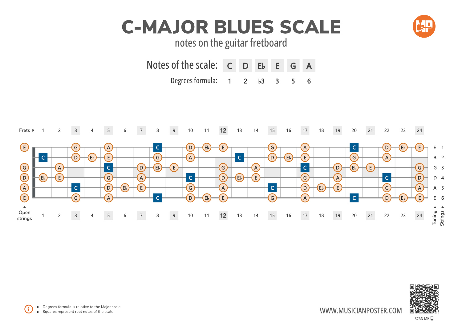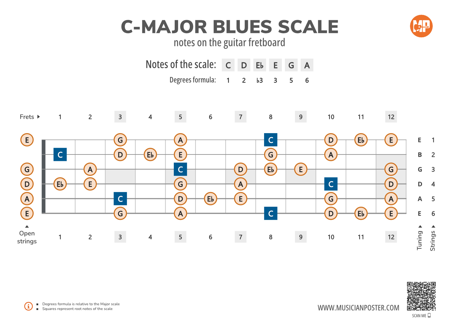 - Scale Formula: Notes that make up the C-Major Blues scale and its degrees formula are conveniently placed right above the diagram so that you don't need to look up another reference.
