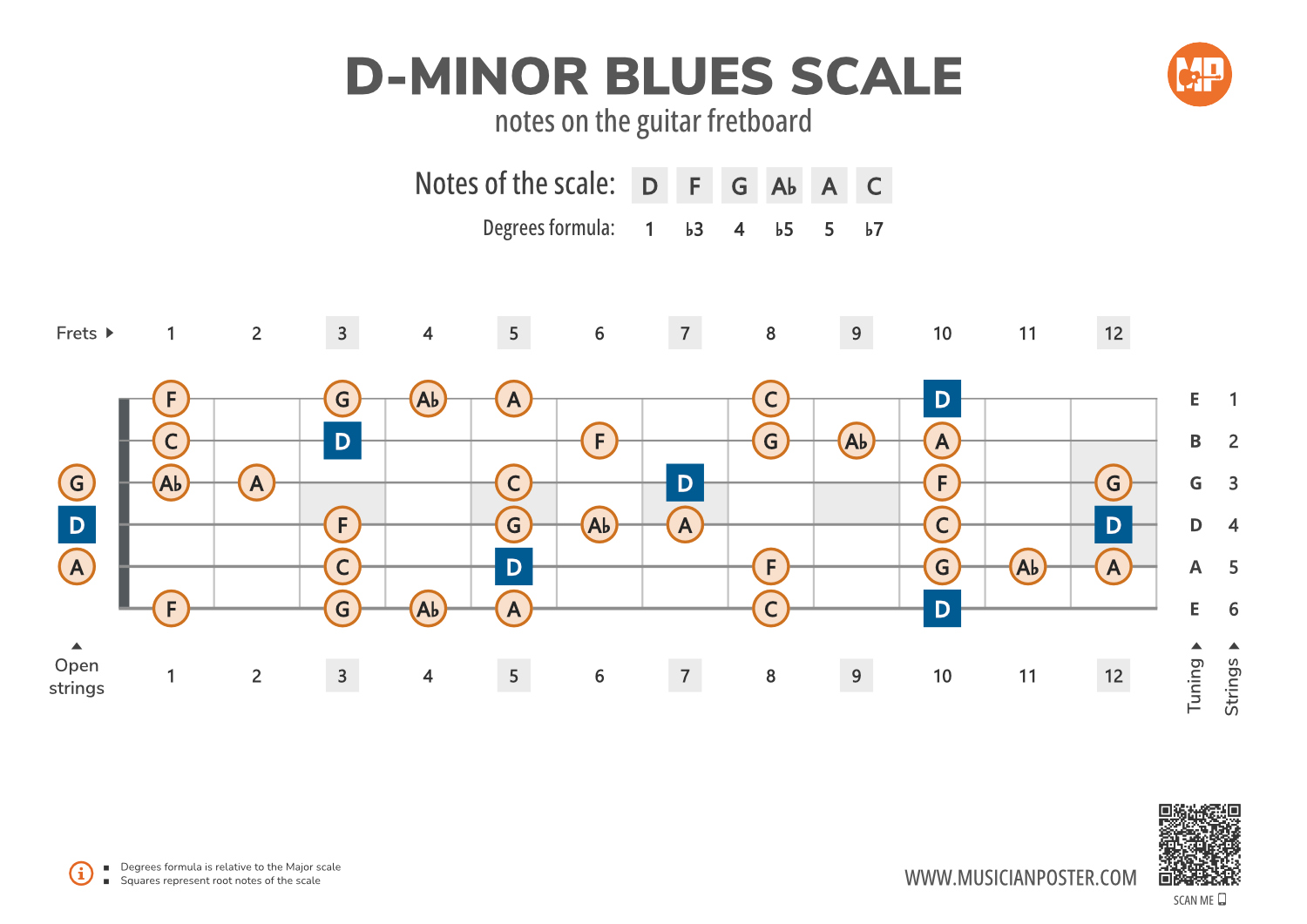 - Scale Formula: Notes that make up the D-Minor Blues scale and its degrees formula are conveniently placed right above the diagram so that you don't need to look up another reference.
