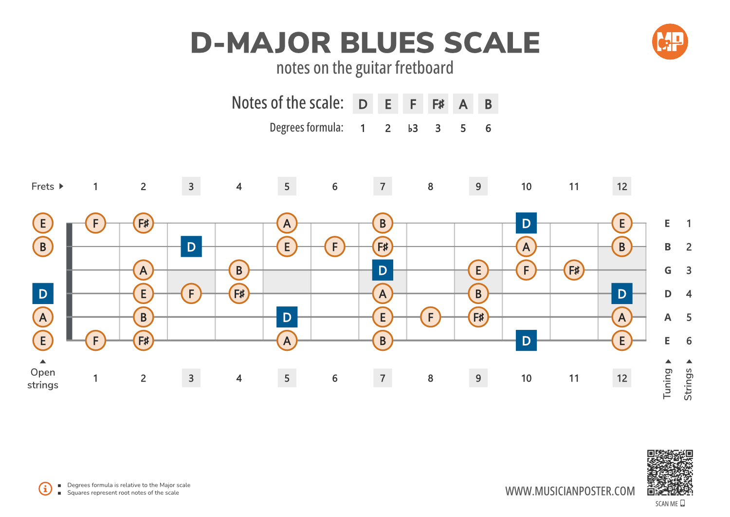- Scale Formula: Notes that make up the D-Major Blues scale and its degrees formula are conveniently placed right above the diagram so that you don't need to look up another reference.