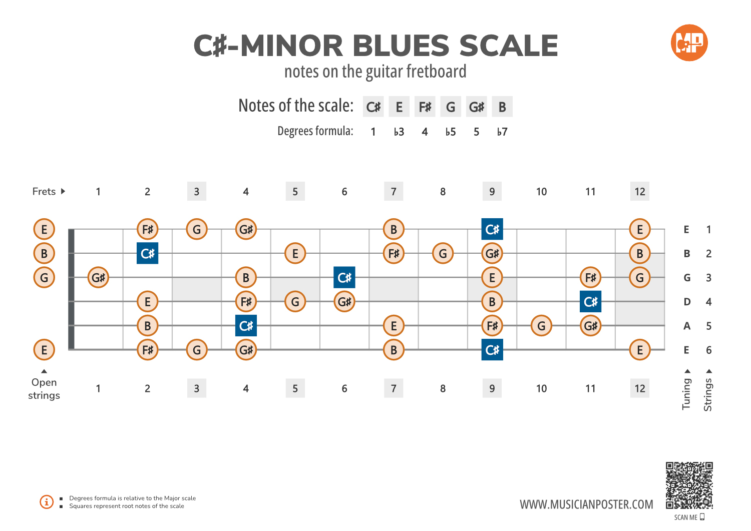 - Scale Formula: Notes that make up the C#-Minor Blues scale and its degrees formula are conveniently placed right above the diagram so that you don't need to look up another reference.