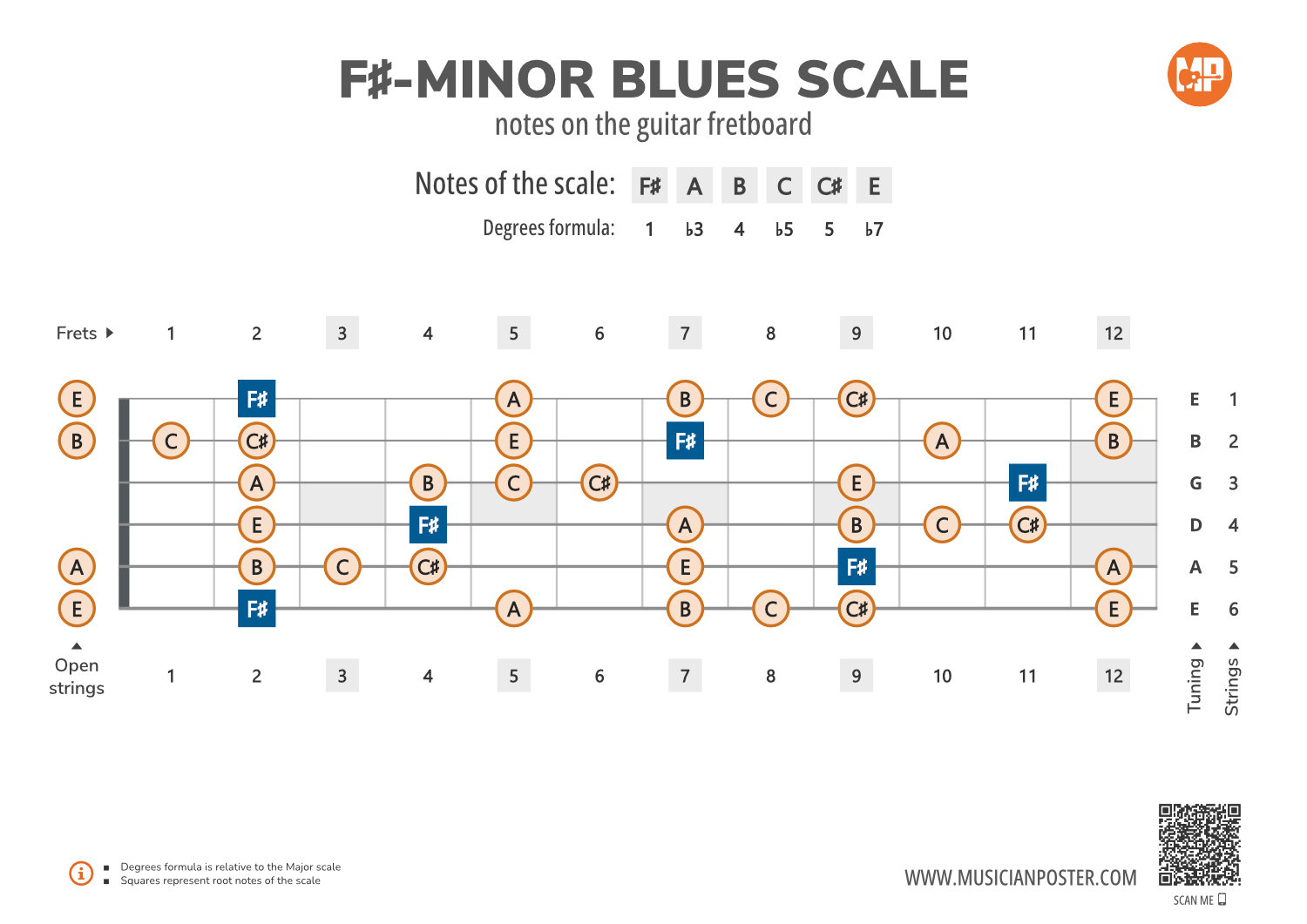 - Scale Formula: Notes that make up the F#-Minor Blues scale and its degrees formula are conveniently placed right above the diagram so that you don't need to look up another reference.