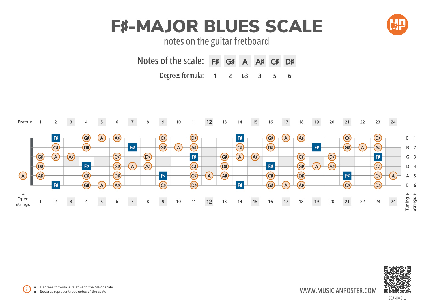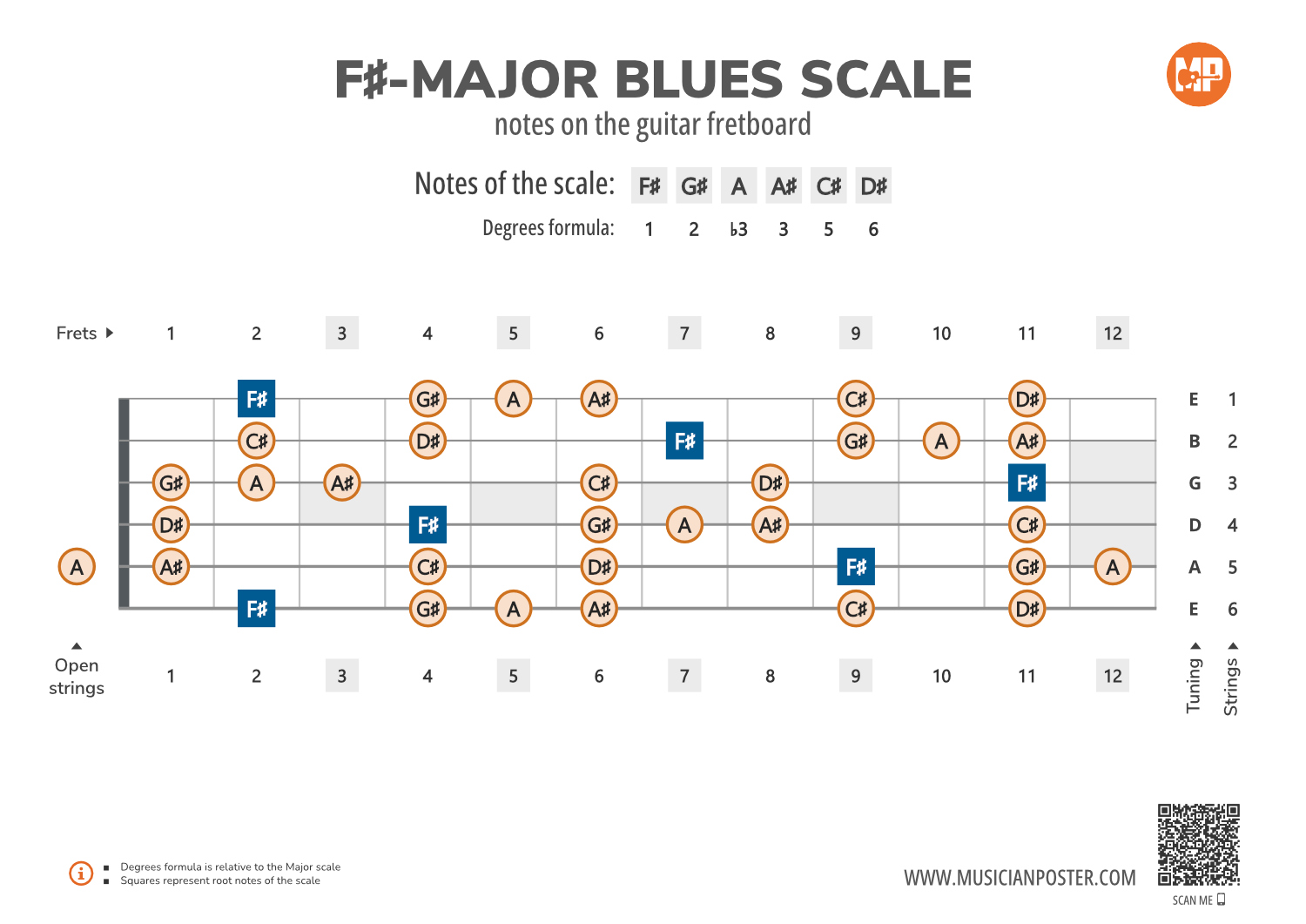- Scale Formula: Notes that make up the F#-Major Blues scale and its degrees formula are conveniently placed right above the diagram so that you don't need to look up another reference.