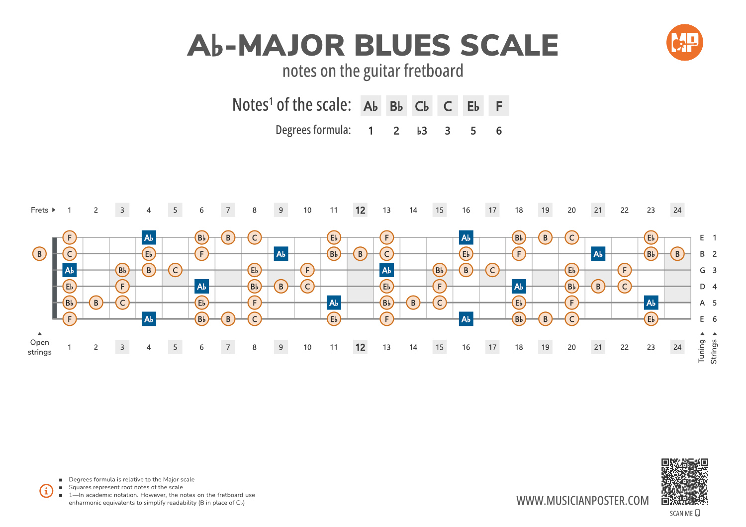 - Scale Formula: Notes that make up the Ab-Major Blues scale and its degrees formula are conveniently placed right above the diagram so that you don't need to look up another reference.