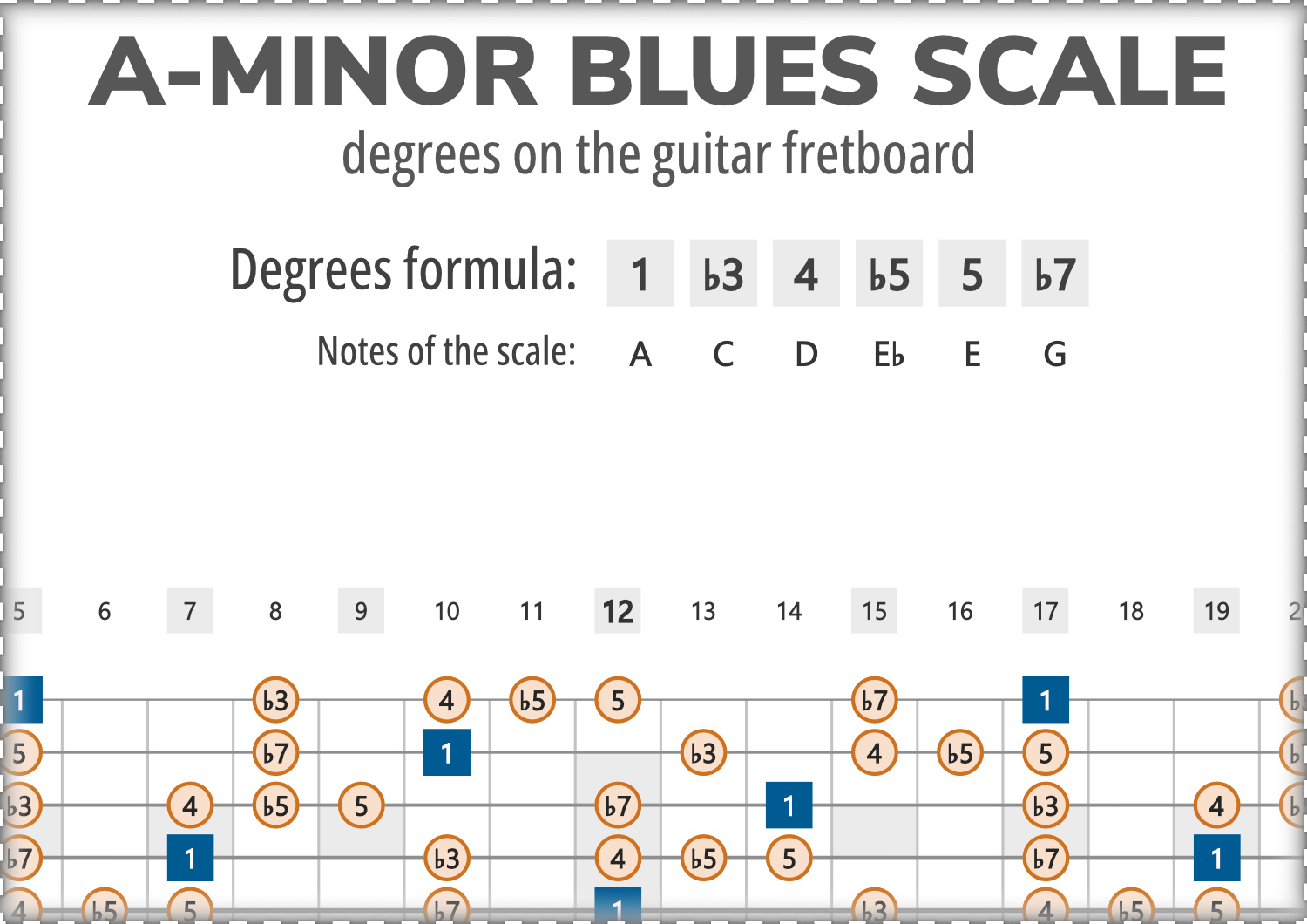 A-Minor Blues consists of the notes A, C, D, Eb, E, G, and its scale-degree formula is 1-b3-4-b5-5-b7.