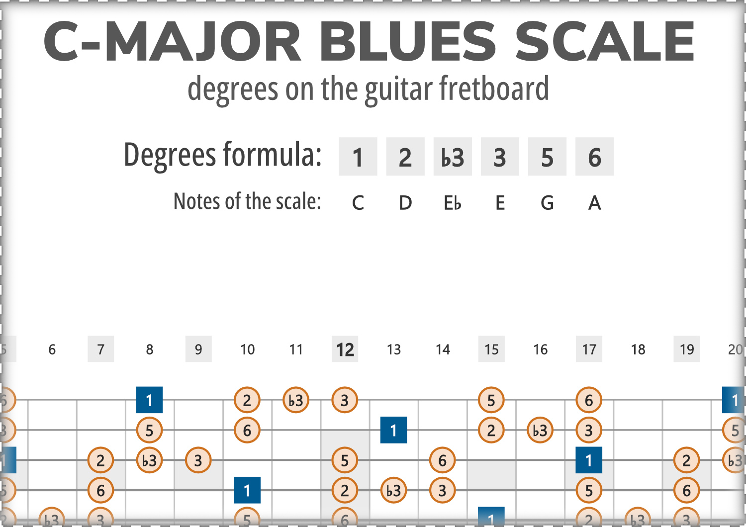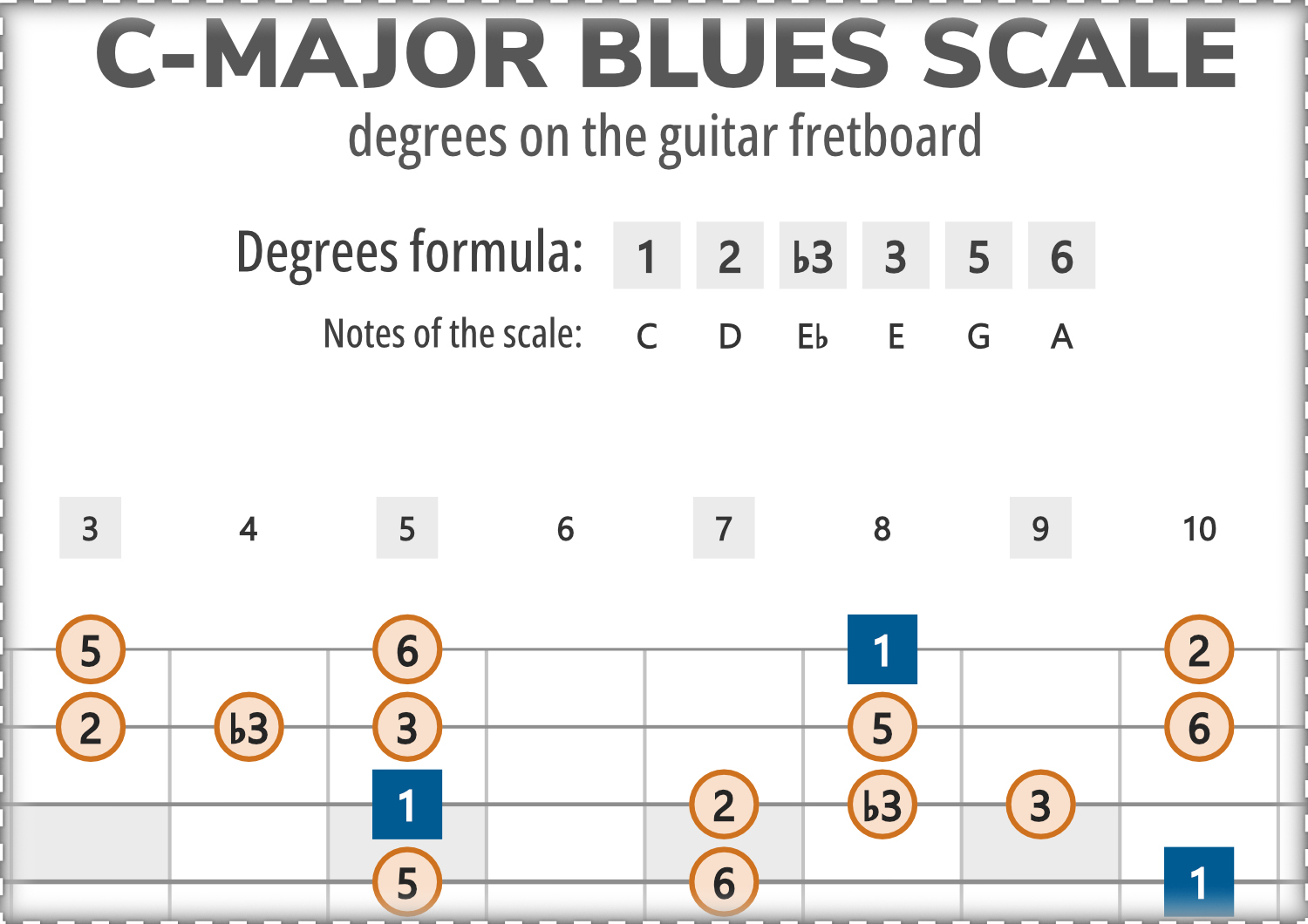 C-Major Blues consists of the notes C, D, Eb, E, G, A, and its scale-degree formula is 1-2-b3-3-5-6.