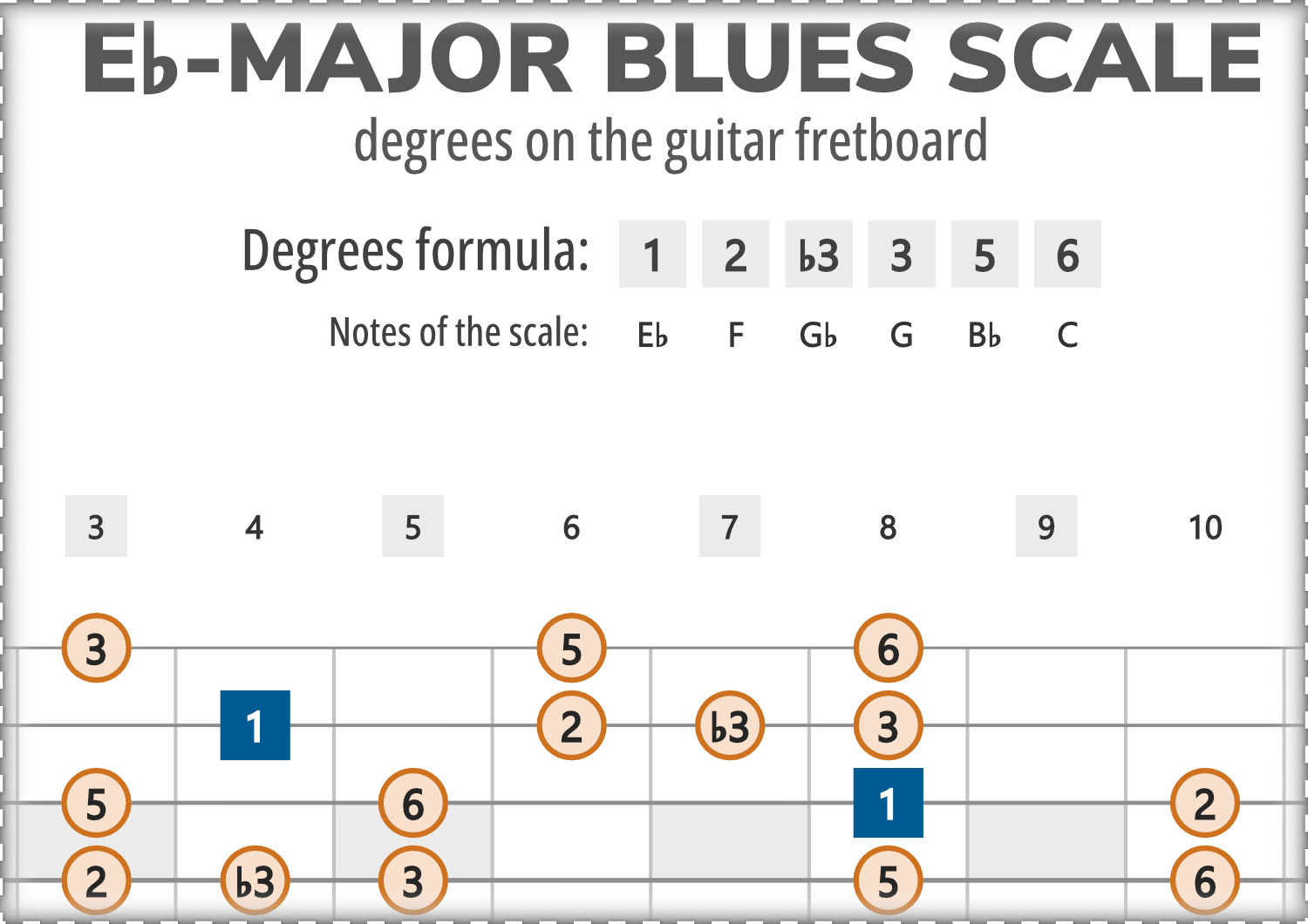Eb-Major Blues consists of the notes Eb, F, Gb, G, Bb, C, and its scale-degree formula is 1-2-b3-3-5-6.