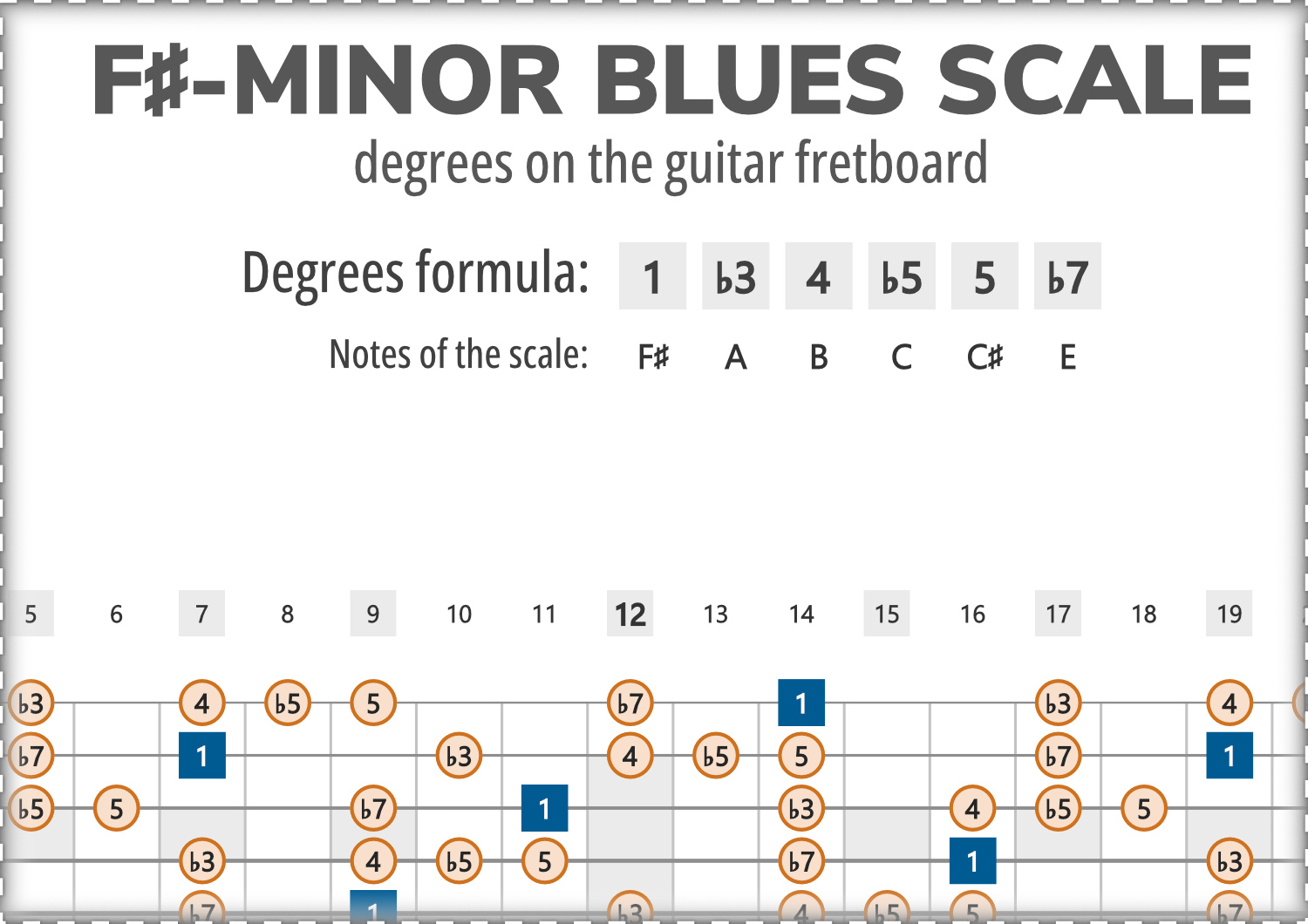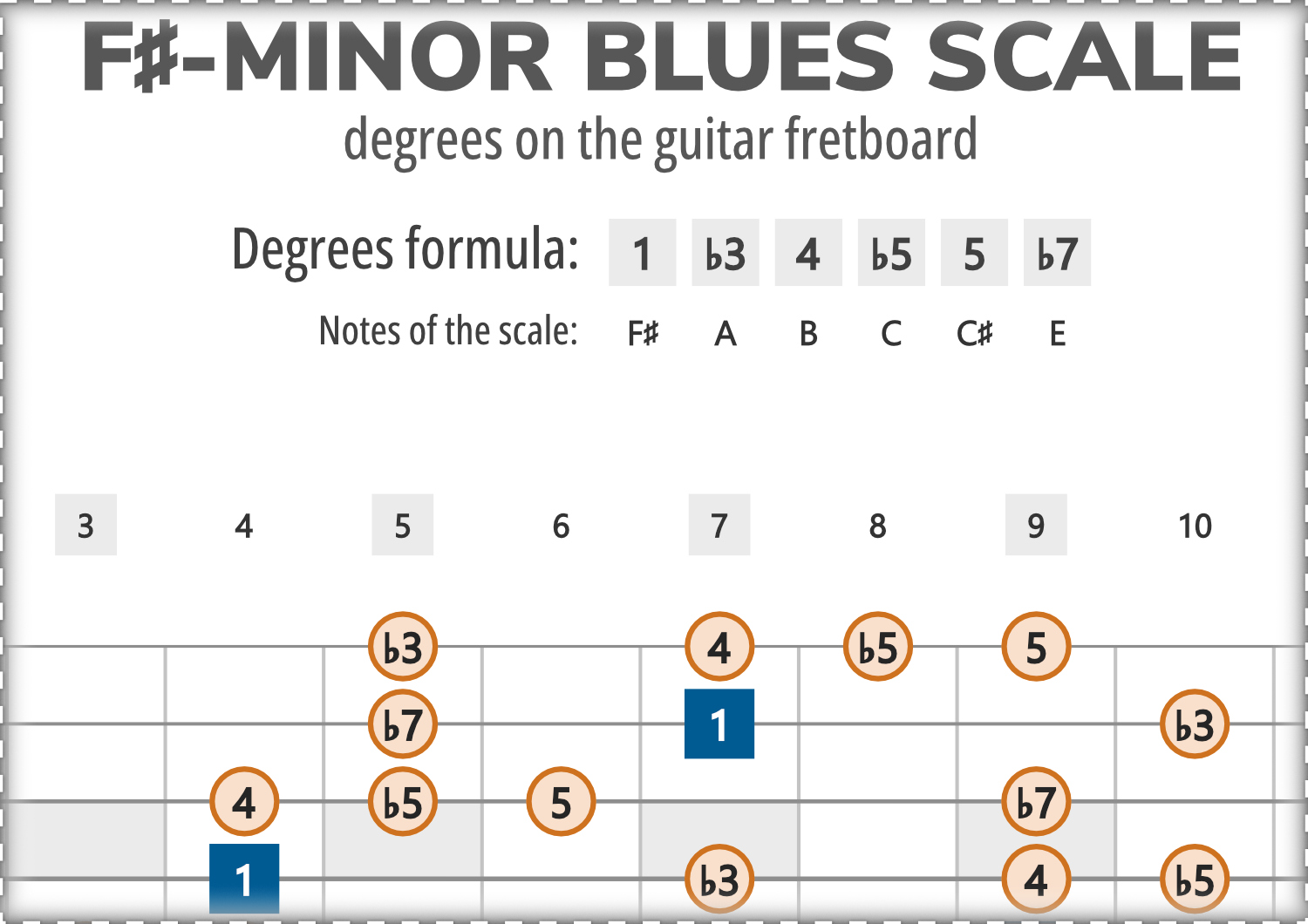 F#-Minor Blues consists of the notes F#, A, B, C, C#, E, and its scale-degree formula is 1-b3-4-b5-5-b7.