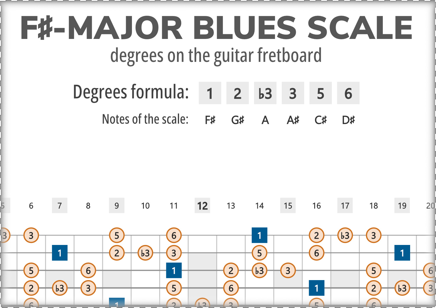 F#-Major Blues consists of the notes F#, G#, A, A#, C#, D#, and its scale-degree formula is 1-2-b3-3-5-6.