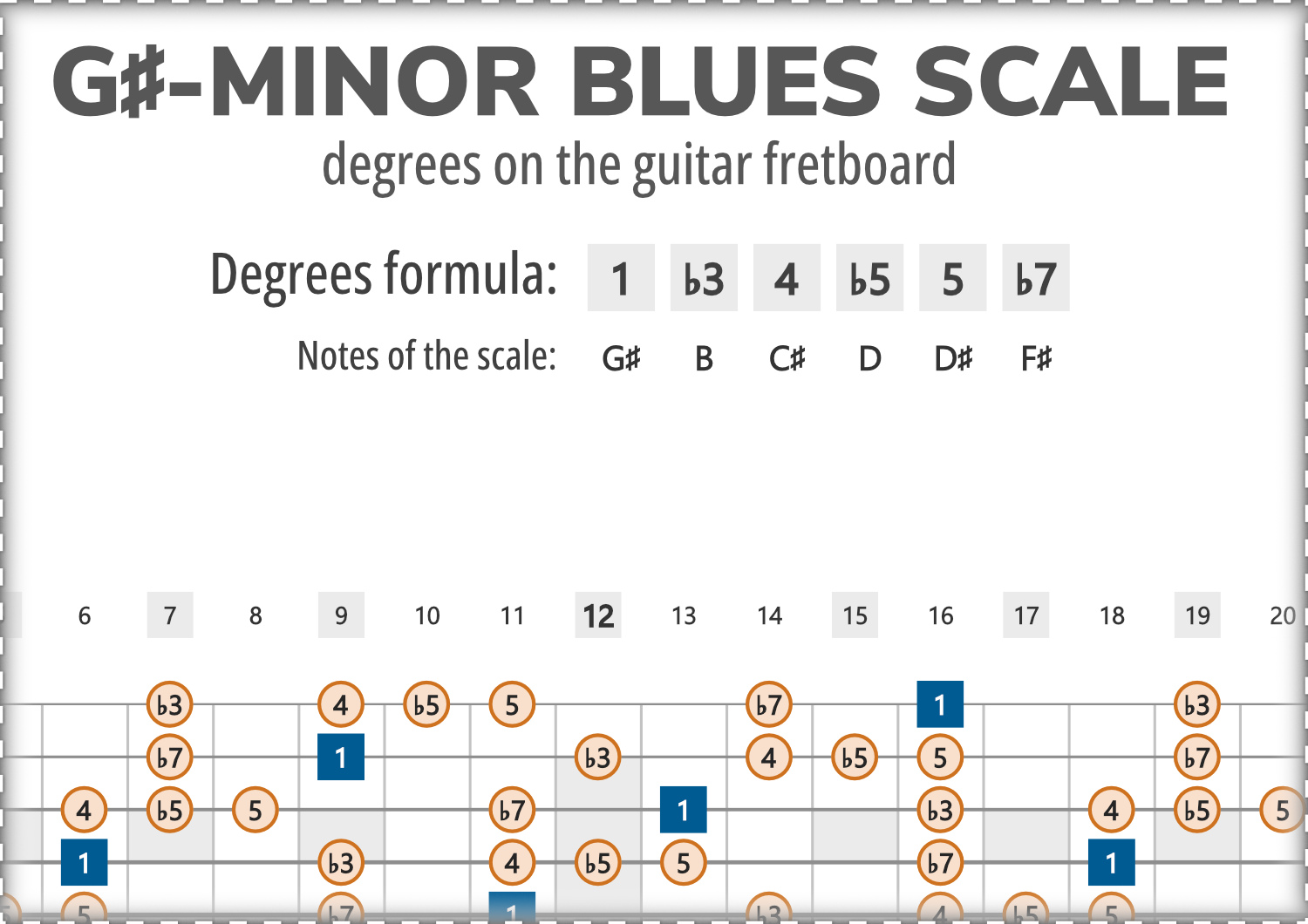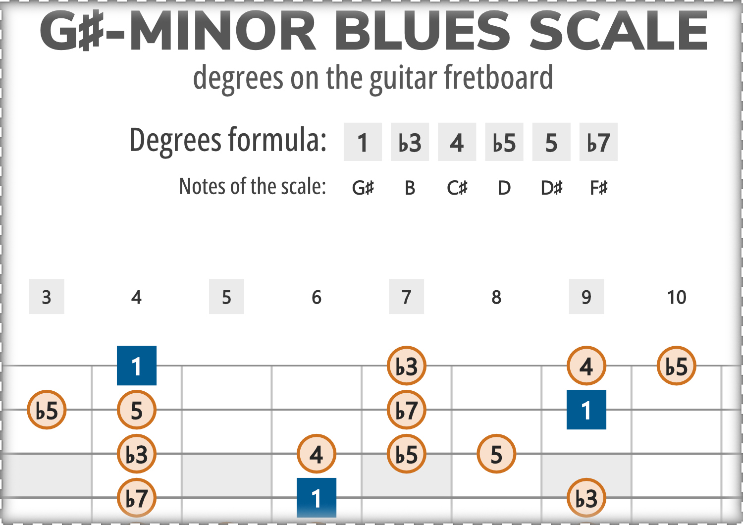 G#-Minor Blues consists of the notes G#, B, C#, D, D#, F#, and its scale-degree formula is 1-b3-4-b5-5-b7.