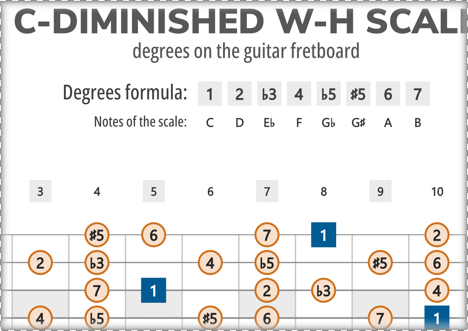 C-Diminished consists of the notes C, D, Eb, F, Gb, G#, A, B, and its scale-degree formula is 1-2-b3-4-b5-#5-6-7.