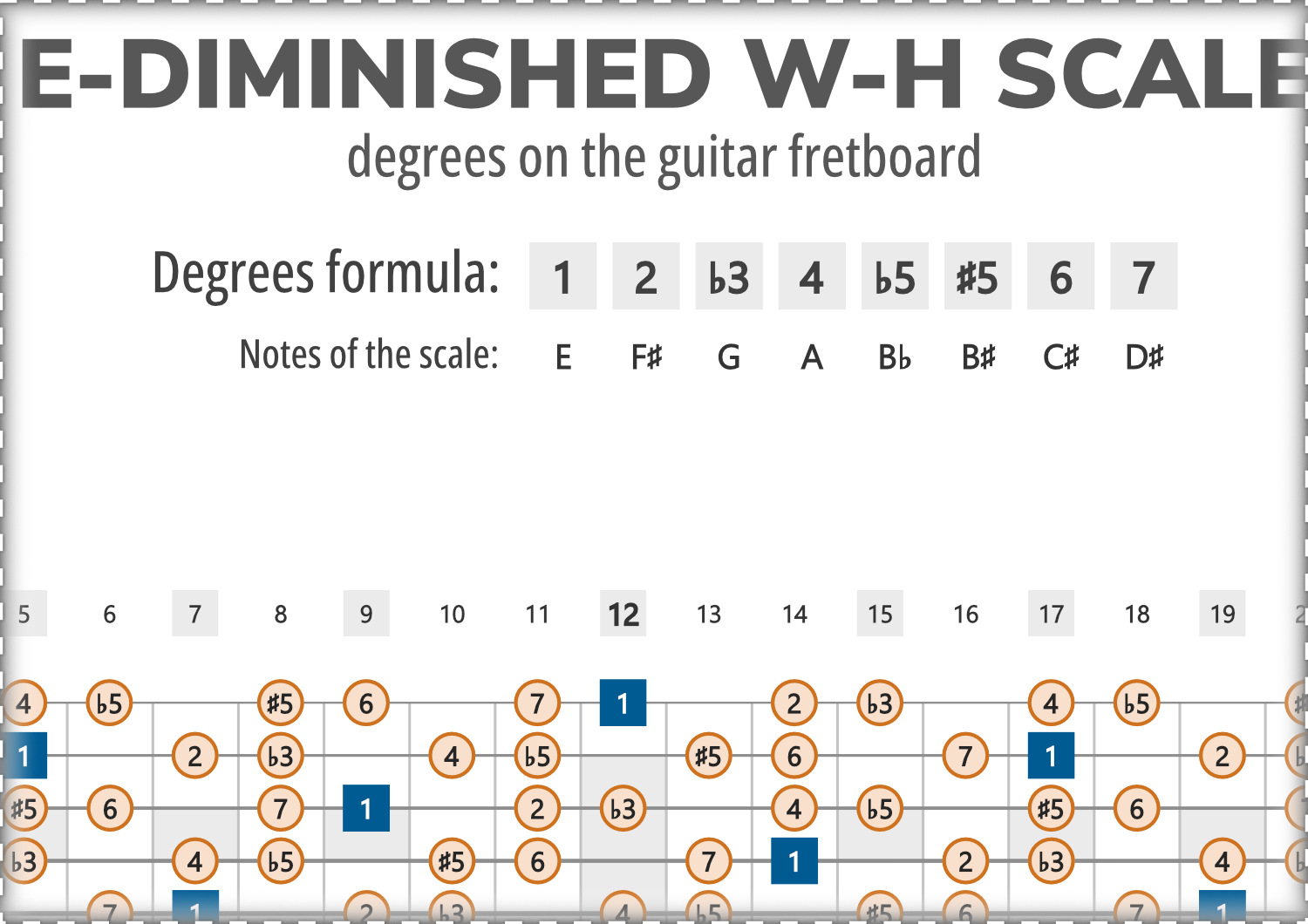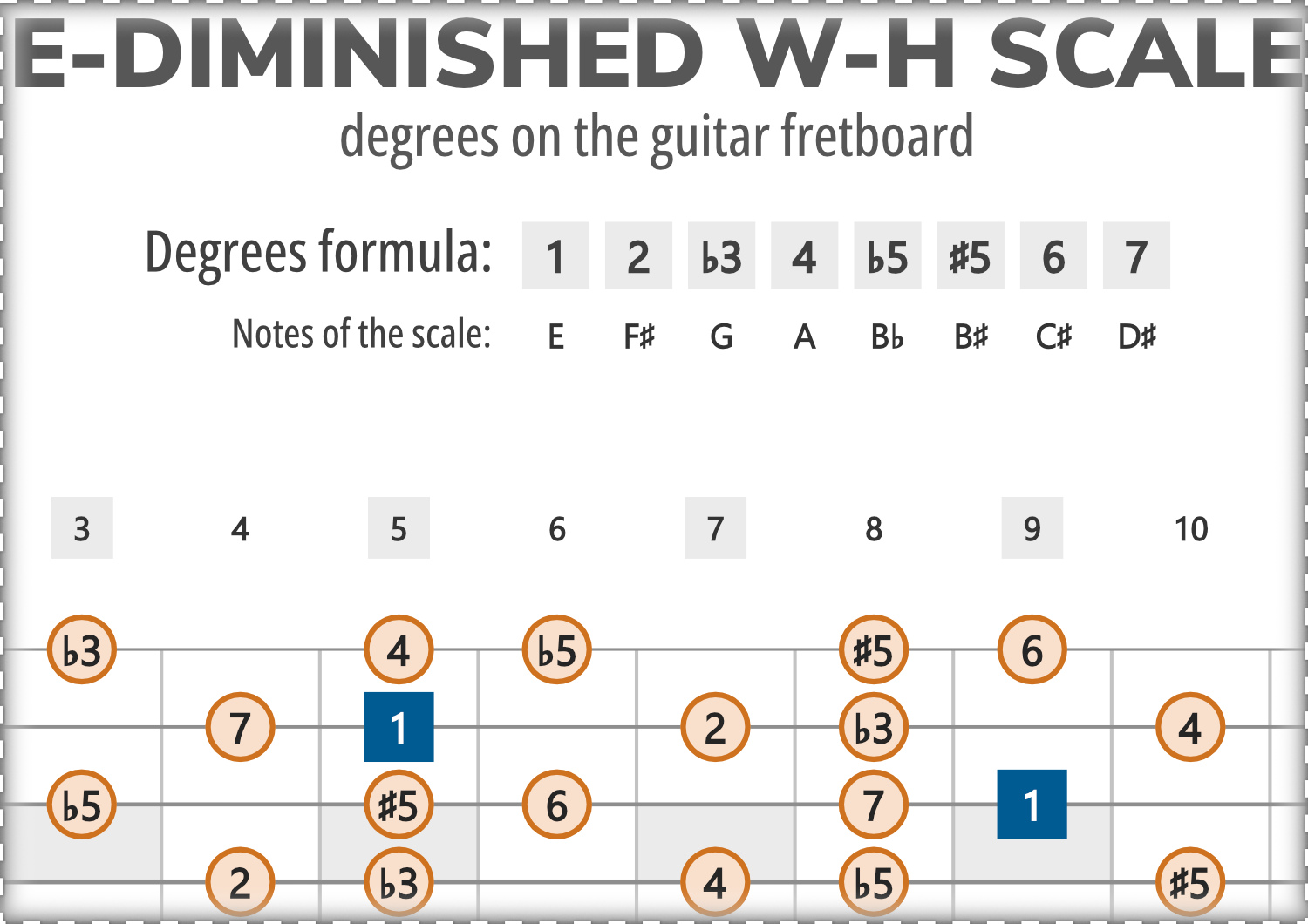 E-Diminished consists of the notes E, F#, G, A, Bb, B#, C#, D#, and its scale-degree formula is 1-2-b3-4-b5-#5-6-7.