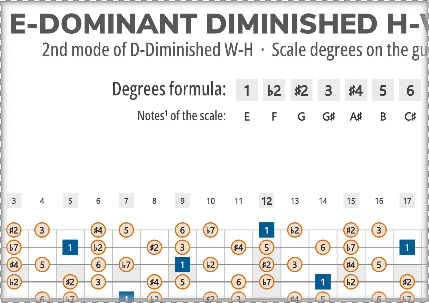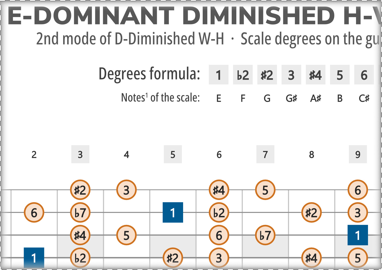 E-Dominant Diminished consists of the notes E, F, G, G#, A#, B, C#, D, and its scale-degree formula is 1-b2-#2-3-#4-5-6-b7.