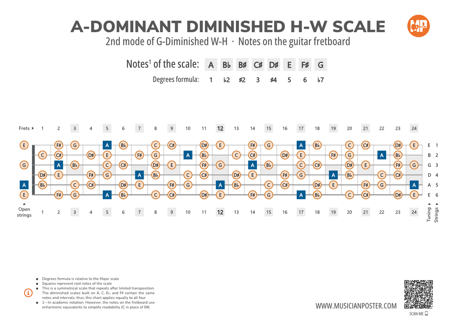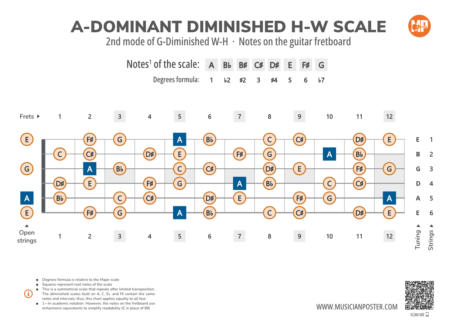 - Scale Formula: Notes that make up the A-Dominant Diminished scale and its degrees formula are conveniently placed right above the diagram so that you don't need to look up another reference.