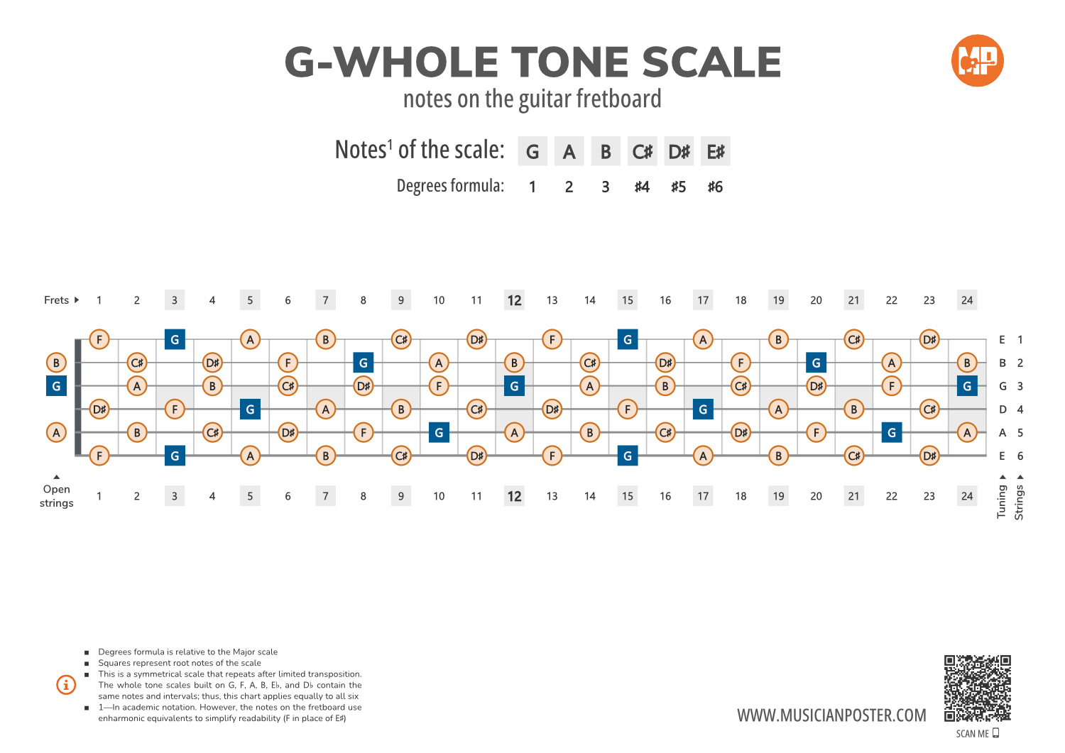 - Scale Formula: Notes that make up the G-Whole Tone scale and its degrees formula are conveniently placed right above the diagram so that you don't need to look up another reference.