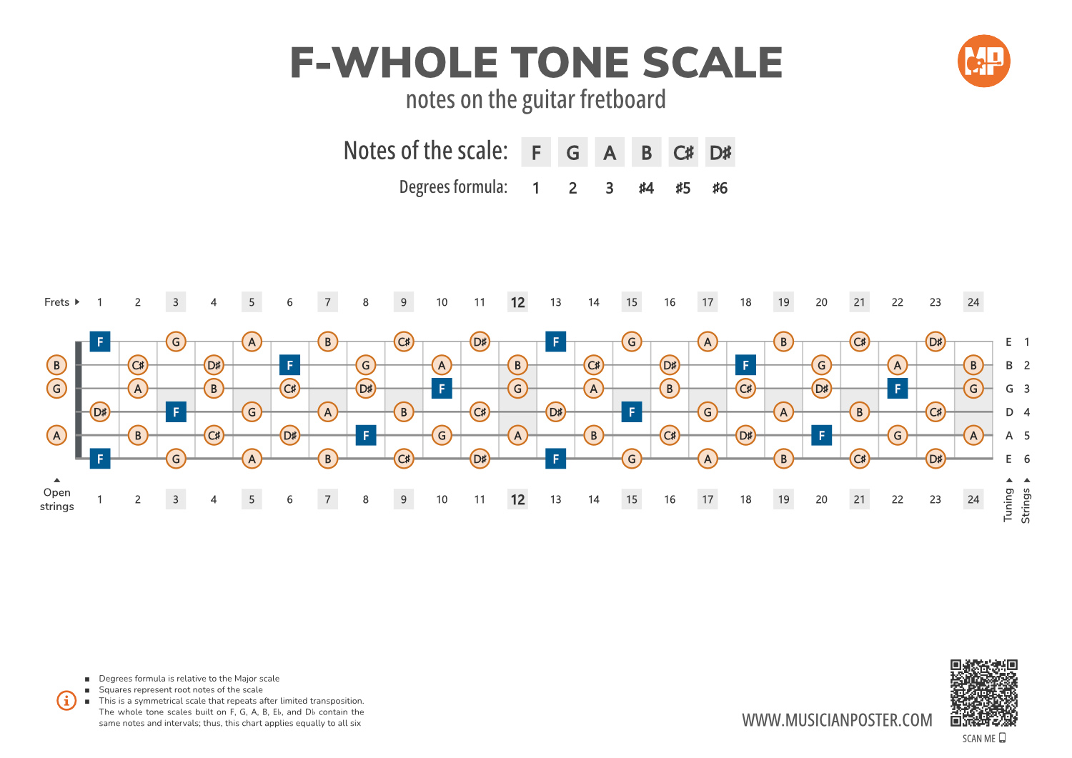- Scale Formula: Notes that make up the F-Whole Tone scale and its degrees formula are conveniently placed right above the diagram so that you don't need to look up another reference.
