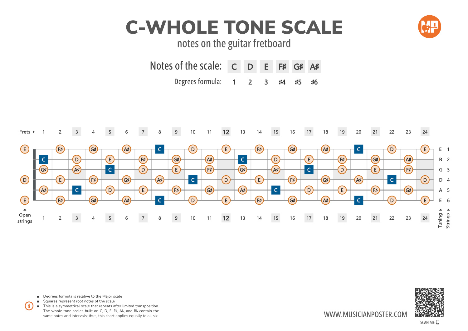 - Scale Formula: Notes that make up the C-Whole Tone scale and its degrees formula are conveniently placed right above the diagram so that you don't need to look up another reference.